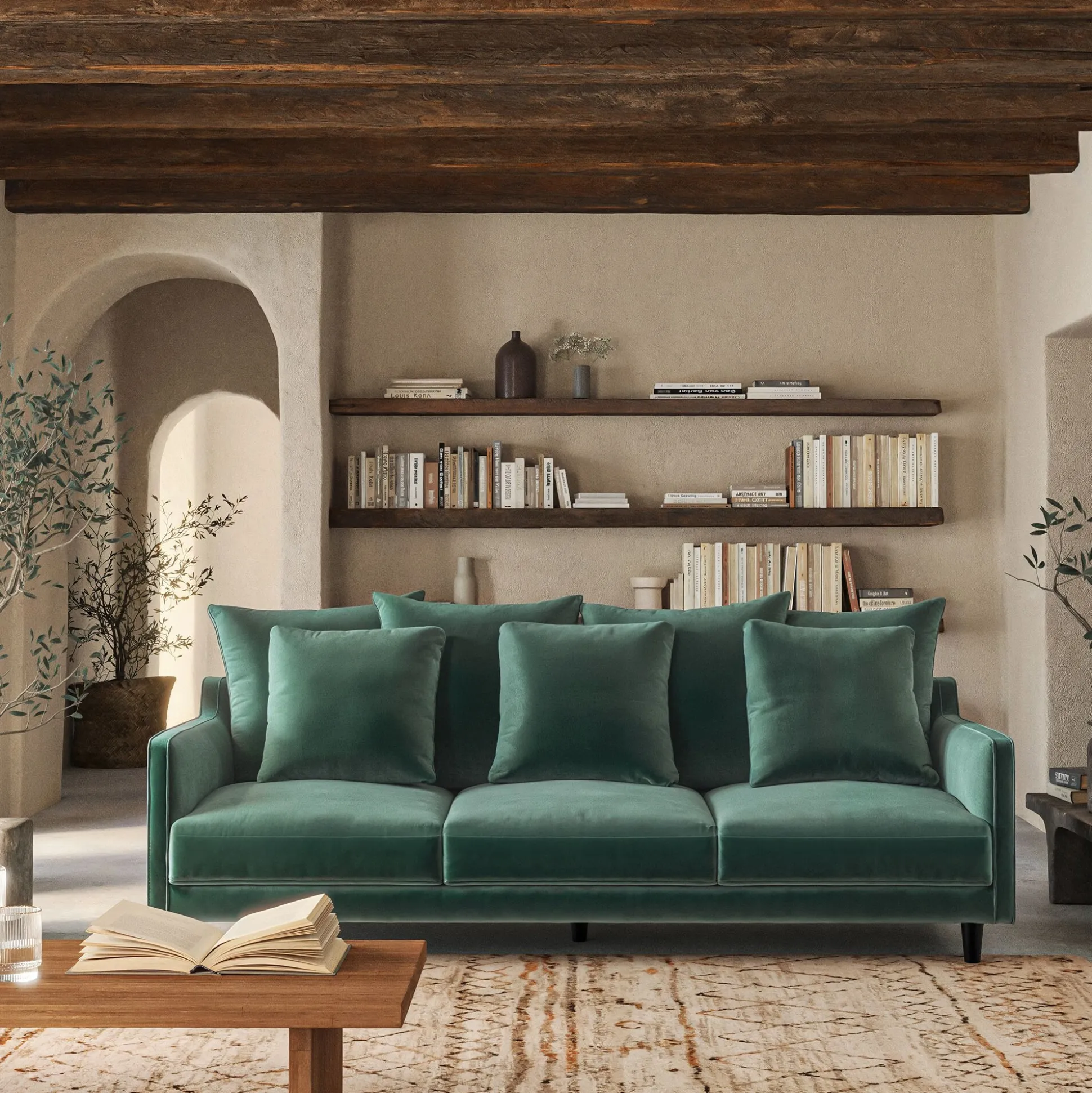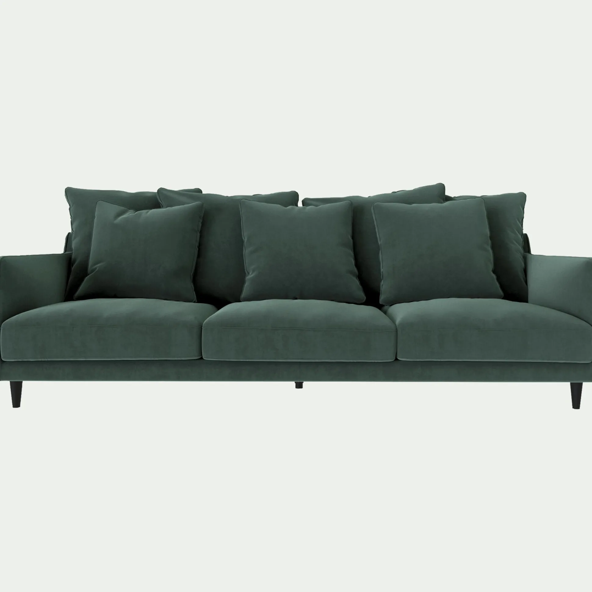 Ce canapé droit 5 places incarne l’élégance italienne dans une version chaleureuse et lumineuse. Revêtu du tissu velvet, au toucher charnu et à l’apparence de velours, il séduit par sa texture délicate et sa douceur exceptionnelle. Son coloris vert sauge adoucit la pièce et insuffle un vent apaisant au décor. Fabriqué à la main en Italie, il témoigne d’un savoir-faire artisanal raffiné. L’assise, généreusement garnie de plumes d’oie, offre un confort moelleux et enveloppant. Monté sur des pieds en hêtre massif, ce modèle entièrement déhoussable marie esthétique et praticité avec brio. Une pièce forte et rayonnante pour sublimer le salon.