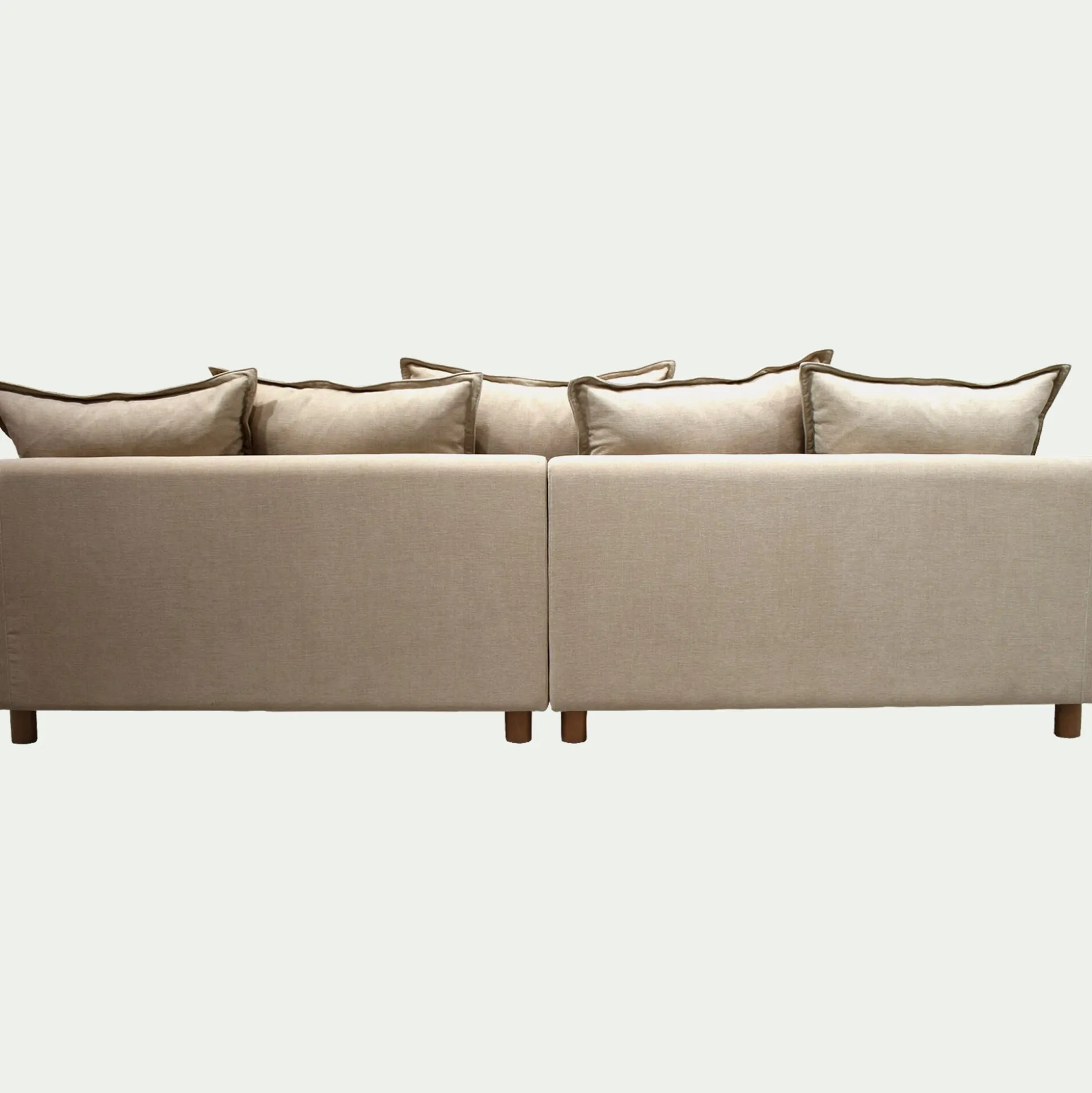 Ce grand canapé modulable séduit par ses lignes généreuses et son design singulier, entre modernité et confort. Entièrement convertible, il se compose de deux modules que l’on peut rapprocher pour former un lit d’appoint, idéal pour les moments de détente prolongés. Revêtu d’un tissu beige, il apporte de la lumière, de la douceur et ainsi participe à une atmosphère apaisante. Ses nombreux coussins renforcent l’esprit cocooning et invitent à s’y lover. Fabriqué en France, dans des ateliers situés près de Bourges, ce canapé reflète le savoir-faire d’artisans passionnés. Une pièce de caractère, conçue avec soin, qui incarne l’élégance à la française.