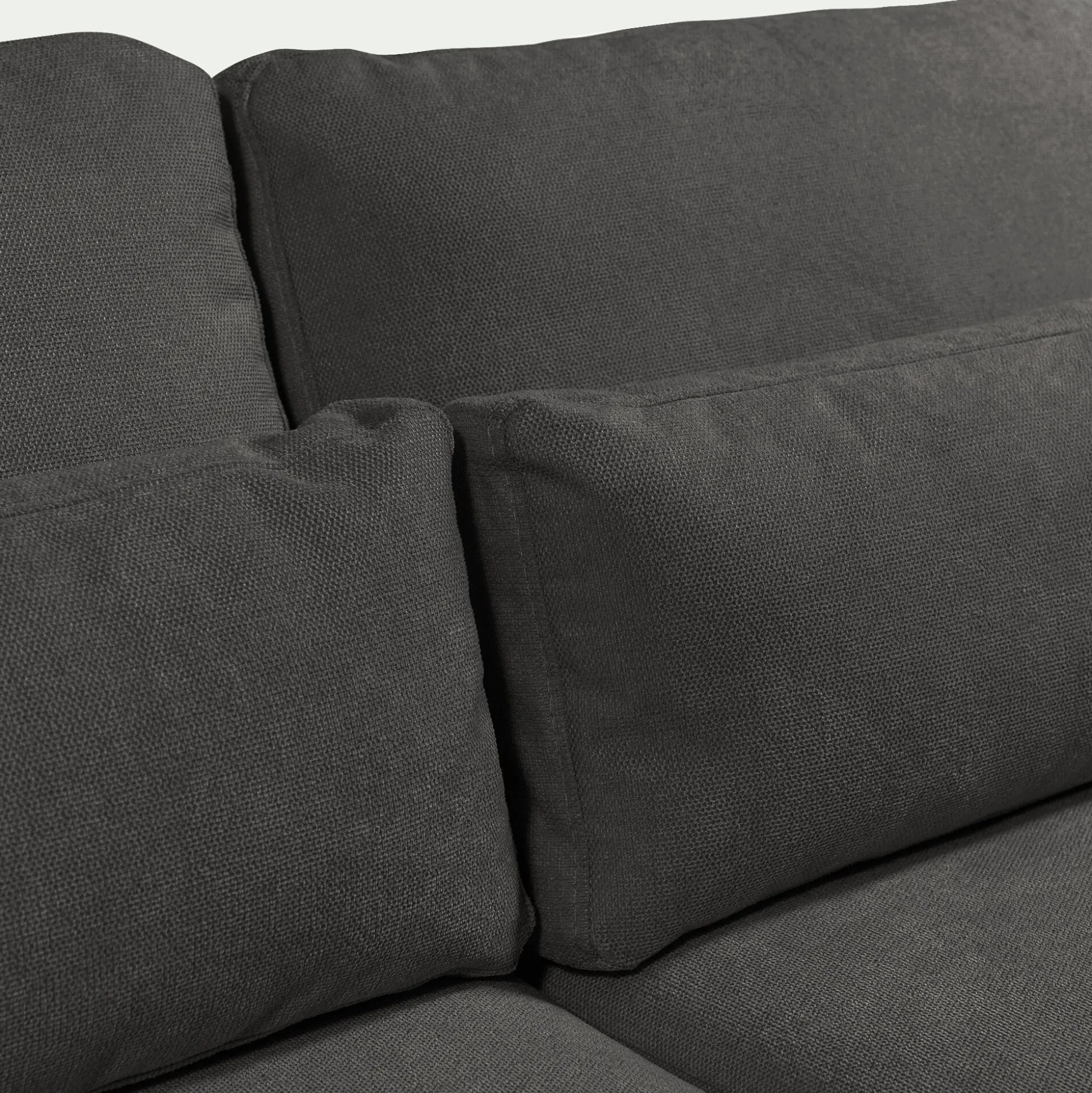 Spacieux et raffiné, le canapé d’angle Batis avec angle à droite transforme le salon en un espace accueillant et élégant. Sa chaise longue offre un espace idéal pour s’allonger et savourer un véritable instant de détente. Revêtu d’un tissu natté résistant, il allie esthétique intemporelle et durabilité. Son coloris gris anthracite, contemporain et polyvalent, apporte du caractère tout en restant chaleureux. Conçu pour durer, ce canapé fixe repose sur une structure en bois massif, garantissant solidité et stabilité. Il s’impose comme l’élément central du séjour, invitant au partage et à la relaxation.