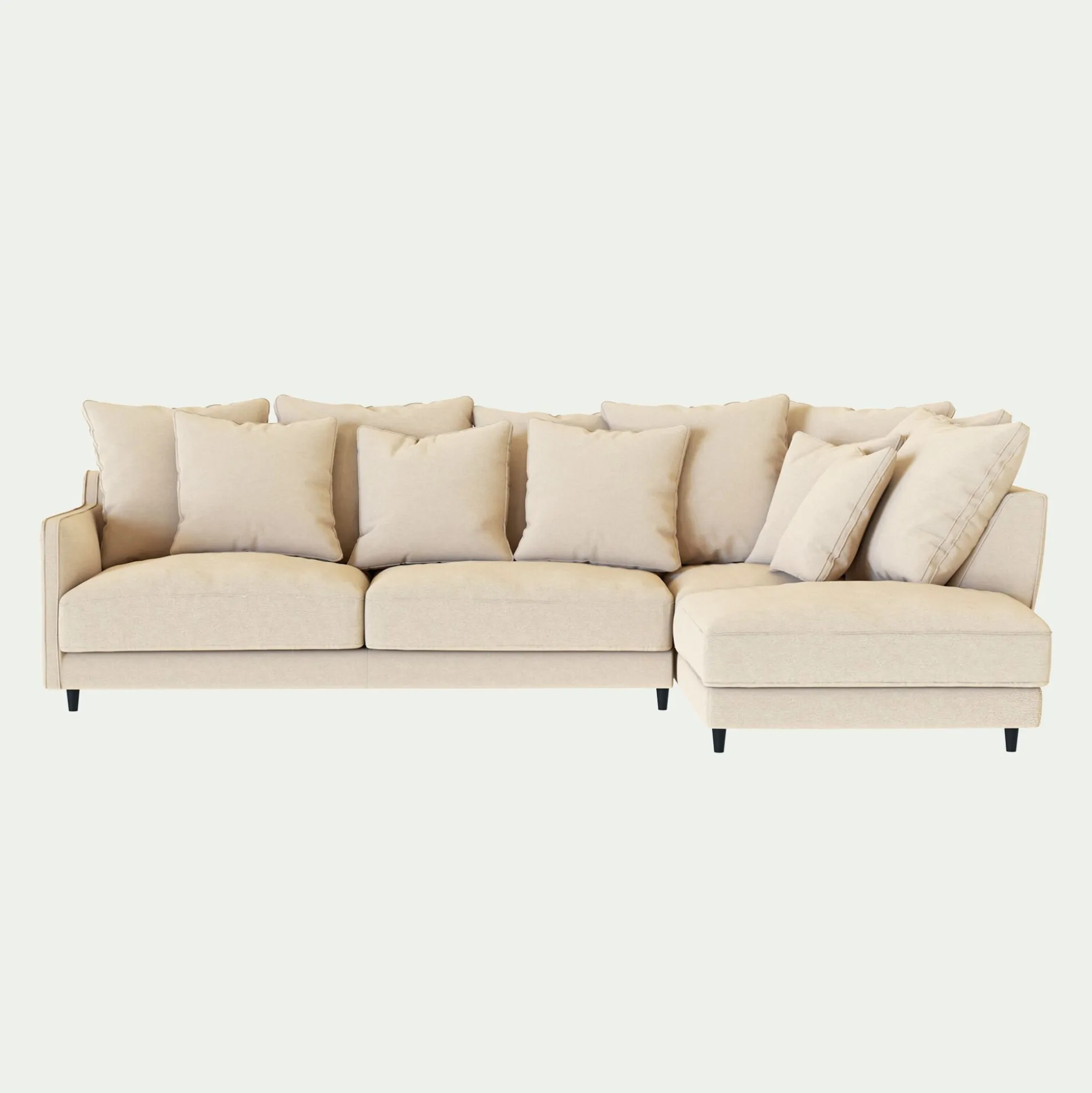 7 coussins dossier 60×60 cm en plumes d’oie et fibre polyester + 4 coussins 50×50 cm en plumes d’oie et fibre polyester.