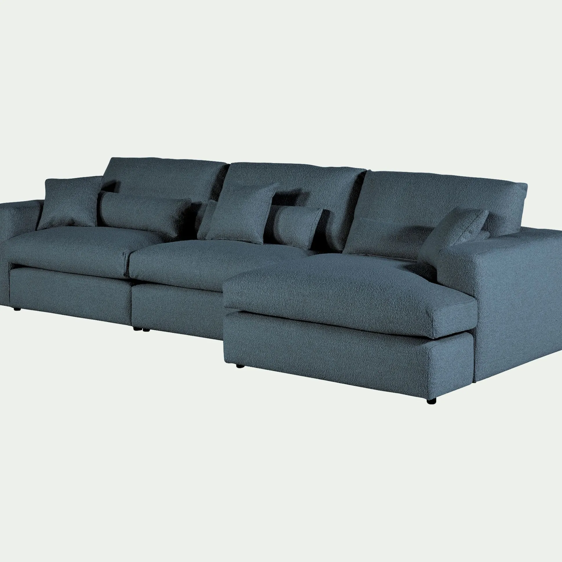 Le canapé Piuma est idéal pour se prélasser dans votre salon. Avec ses grandes assises, ce canapé d’angle droit en tissu bouclette vous offre un confort exceptionnel. Il vous permet de vous détendre au coeur de coussins moelleux dans un nuage de douceur renforcé par son tissu délicat. Vous pourrez ainsi recevoir famille et amis lors d’un moment apaisant. Ce canapé fixe de couleur bleu apporte également une touche design moderne et élégante à votre salon. Son tissu bouclette donne un côté cocooning qui vous permet de transformer votre pièce en un espace chaleureux.