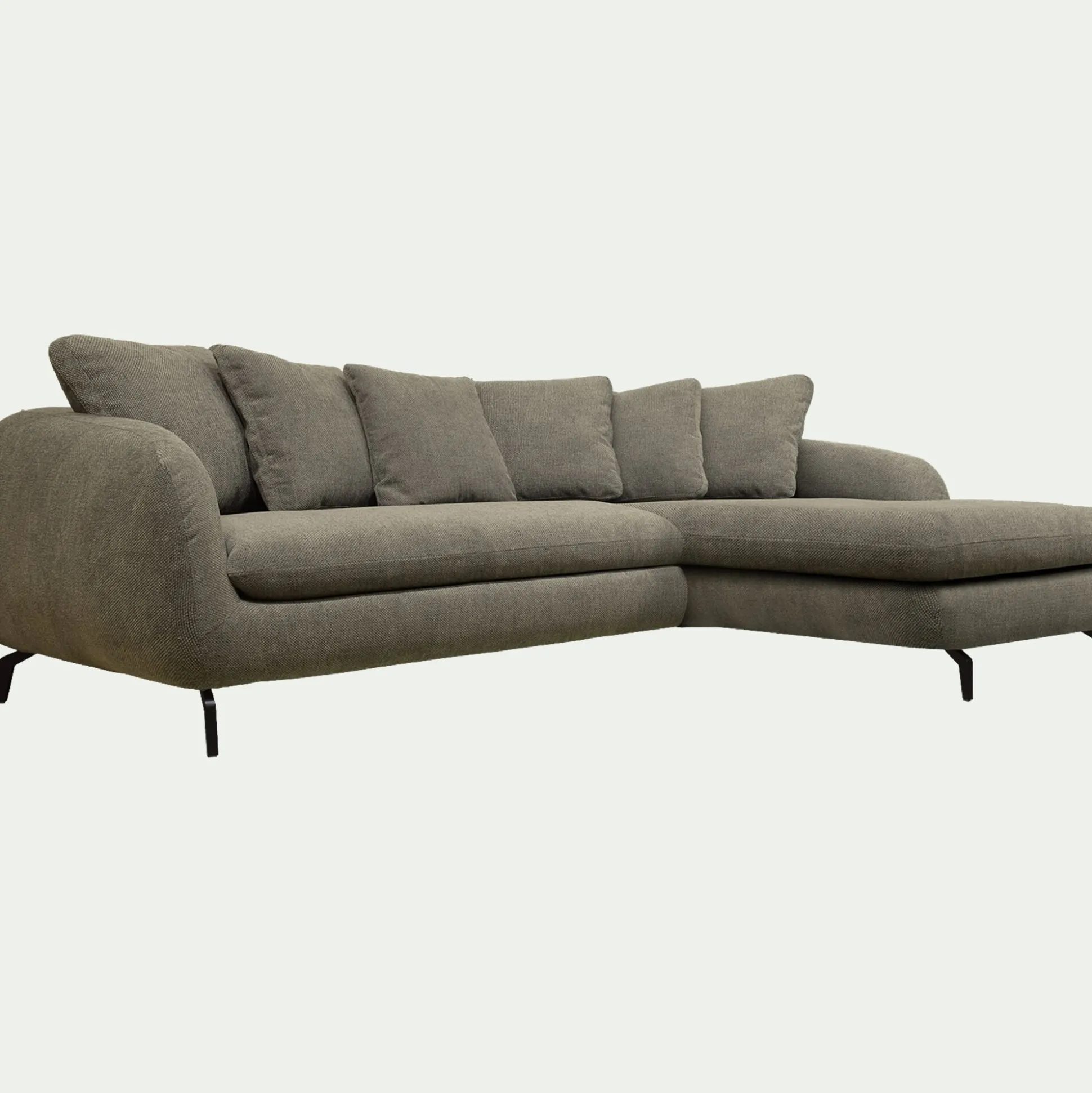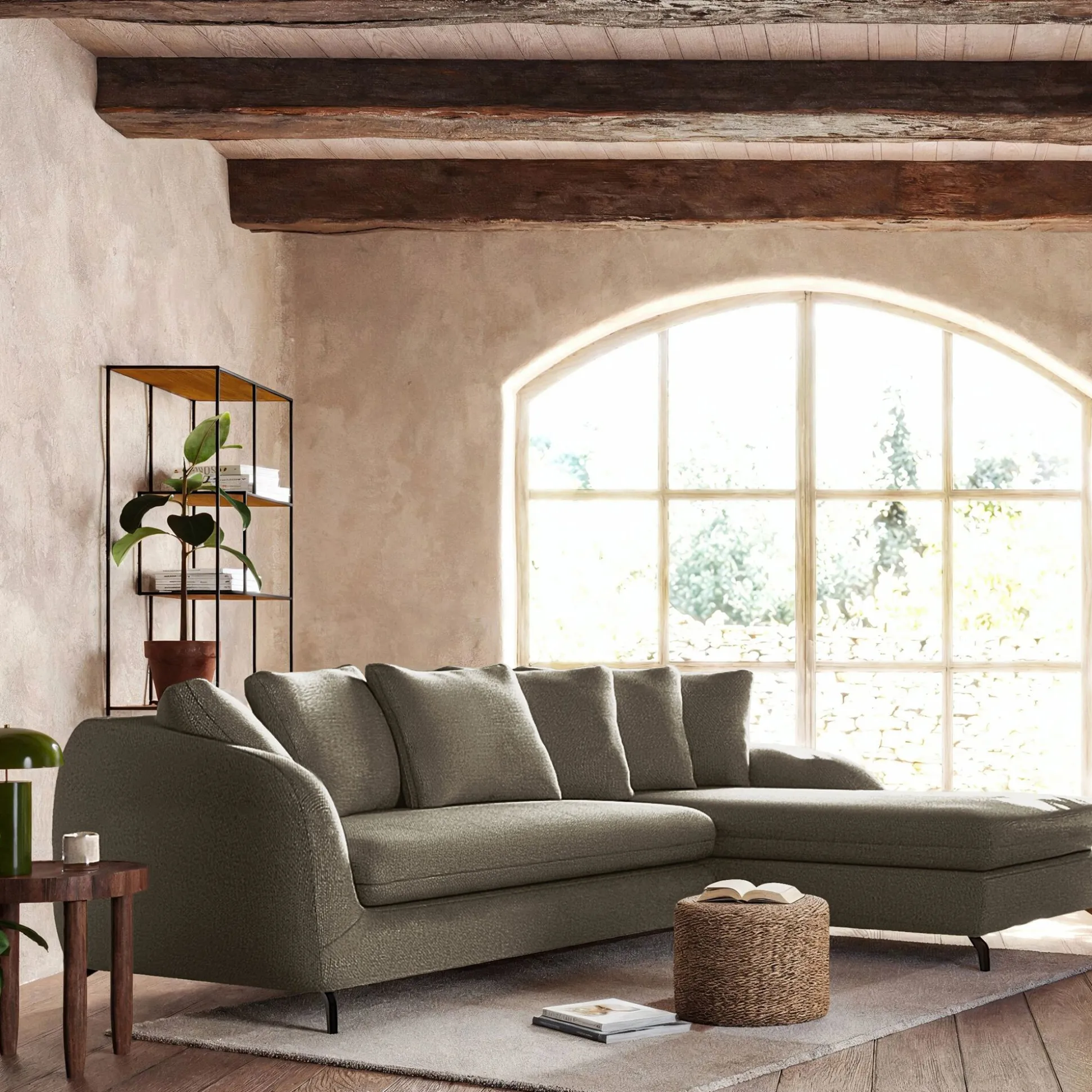 Un joli canapé d’angle droit en tissu pour profiter agréablement de votre salon. Un look contemporain et accueillant, sublimé par un piétement original en acier noir. Vous apprécierez la forme du dossier et des accoudoirs qui vous offrent un maintien optimal de votre dos pour un confort d’assise exceptionnel. Un canapé fabriqué en France, dans des ateliers proches de la ville de Bourge, qui incarne l’excellence du savoir-faire français. Un coloris vert garrigue qui apporte une note citadine et raffinée à votre décoration de salon.