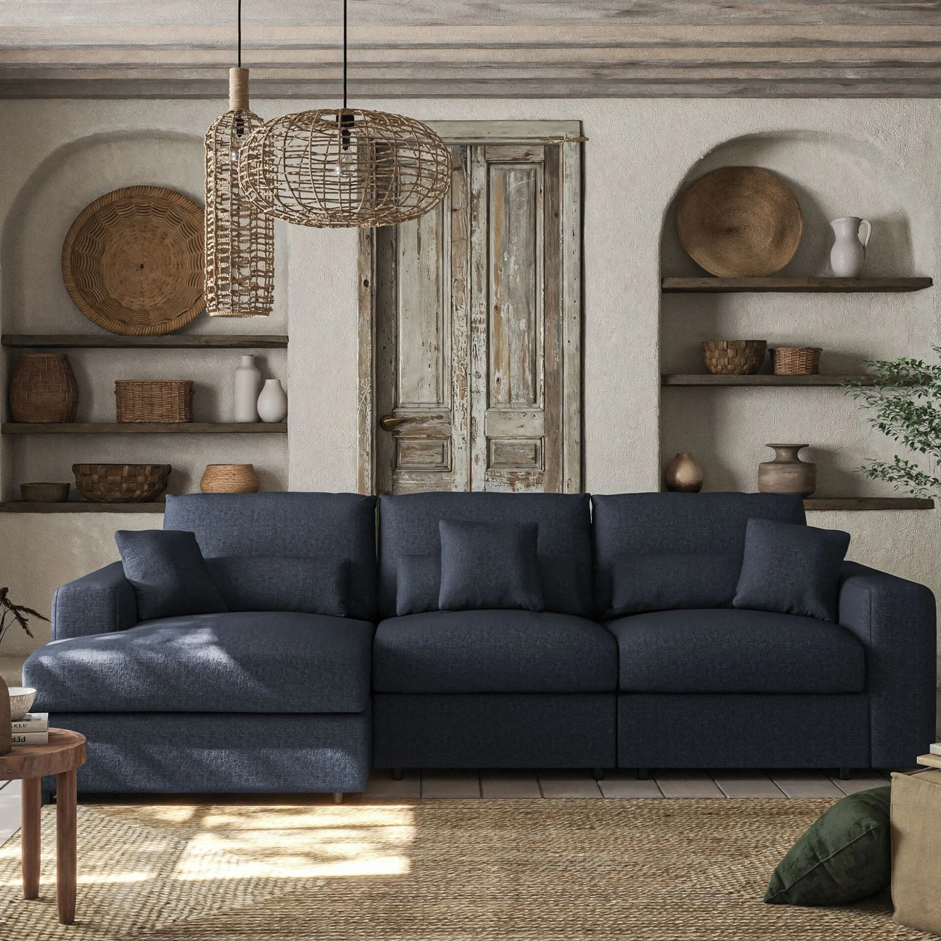 Avec son format généreux 5 places et son angle à gauche, ce canapé d’angle est une invitation aux moments partagés. Son revêtement en tissu chenille, à la fois doux et résistant, enveloppe l’espace d’une chaleur réconfortante. Son coloris bleu marine, intemporel, s’harmonise avec tous les styles d’intérieur. Pensé pour le confort, ce canapé fixe se compose d’une assise spacieuse, d’un dossier accueillant et de coussins déhoussables pour un entretien facilité. Six coussins décoratifs viennent parfaire l’ensemble, ajoutant une touche cosy. Un canapé idéal pour des instants de détente en famille ou entre amis.