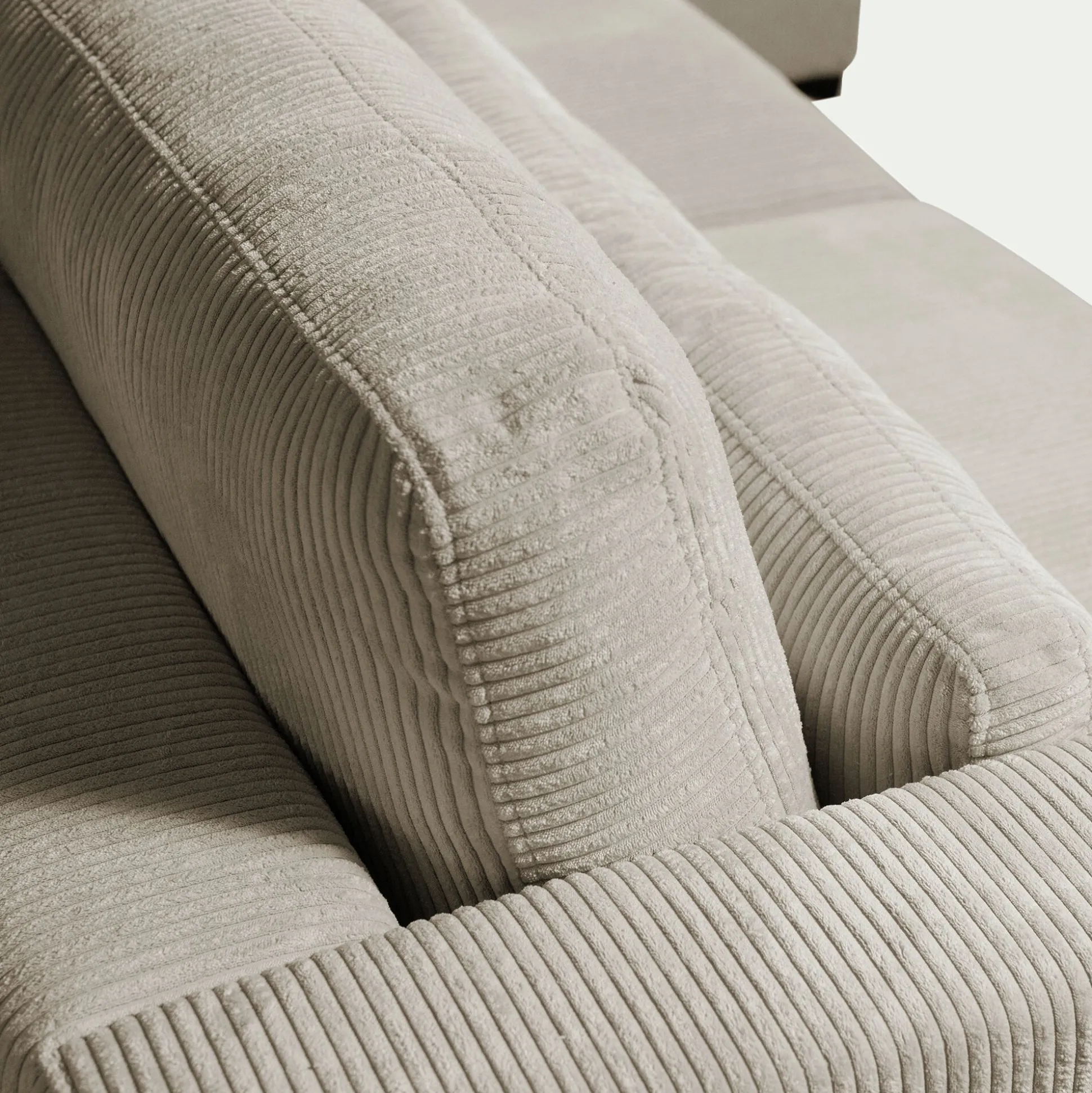 Ce canapé d’angle avec méridienne à droite transforme le salon en un véritable espace bien-être. Son grand format accueille toute la famille ou permet de s’allonger entièrement pour une détente absolue. Revêtu d’un velours côtelé dans un coloris taupe à la fois naturel et intemporel, il séduit par son toucher doux et soyeux, reflétant la lumière pour une touche de brillance. Son assise profonde repose sur une structure en bois massif et des ressorts qui garantissent un maintien souple et durable. Pratique, ses coussins de dossier et d’assise sont déhoussables pour un entretien facilité. Généreux et élégant, ce grand canapé fixe insuffle du caractère à la pièce et s’impose comme un allié incontournable des instants de détente et de convivialité.