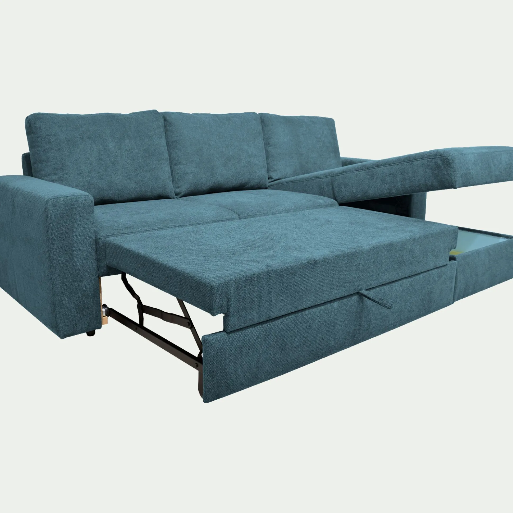 Ce canapé bleu arbore un coloris emblématique de notre palette méditerranéenne : le bleu figuerolles. Il rend ainsi hommage à notre belle région mais plus globalement au savoir-faire français grâce à sa fabrication locale. Le bleu est une couleur apaisante qui saura adoucir la décoration de votre salon tout en lui donnant du peps. Au-delà d’être un meuble décoratif, le canapé Honore présente de nombreuses caractéristiques pratiques. Ce canapé 4 places en tissu arbore une grande méridienne aux multiples visages. C’est tout d’abord un atout confort pour les soirées à la maison, mais aussi un espace de rangement bien dissimulé. En effet, la méridienne cache un coffre de rangement, parfait pour désencombrer votre salon. La méridienne de ce canapé d’angle est réversible : elle se place à droite ou à gauche du canapé selon votre aménagement. Enfin, c’est un canapé d’angle convertible. En un seul geste, un couchage de 140×200 cm fait son apparition et permet d’accueillir vos invités le temps d’une ou plusieurs nuits.