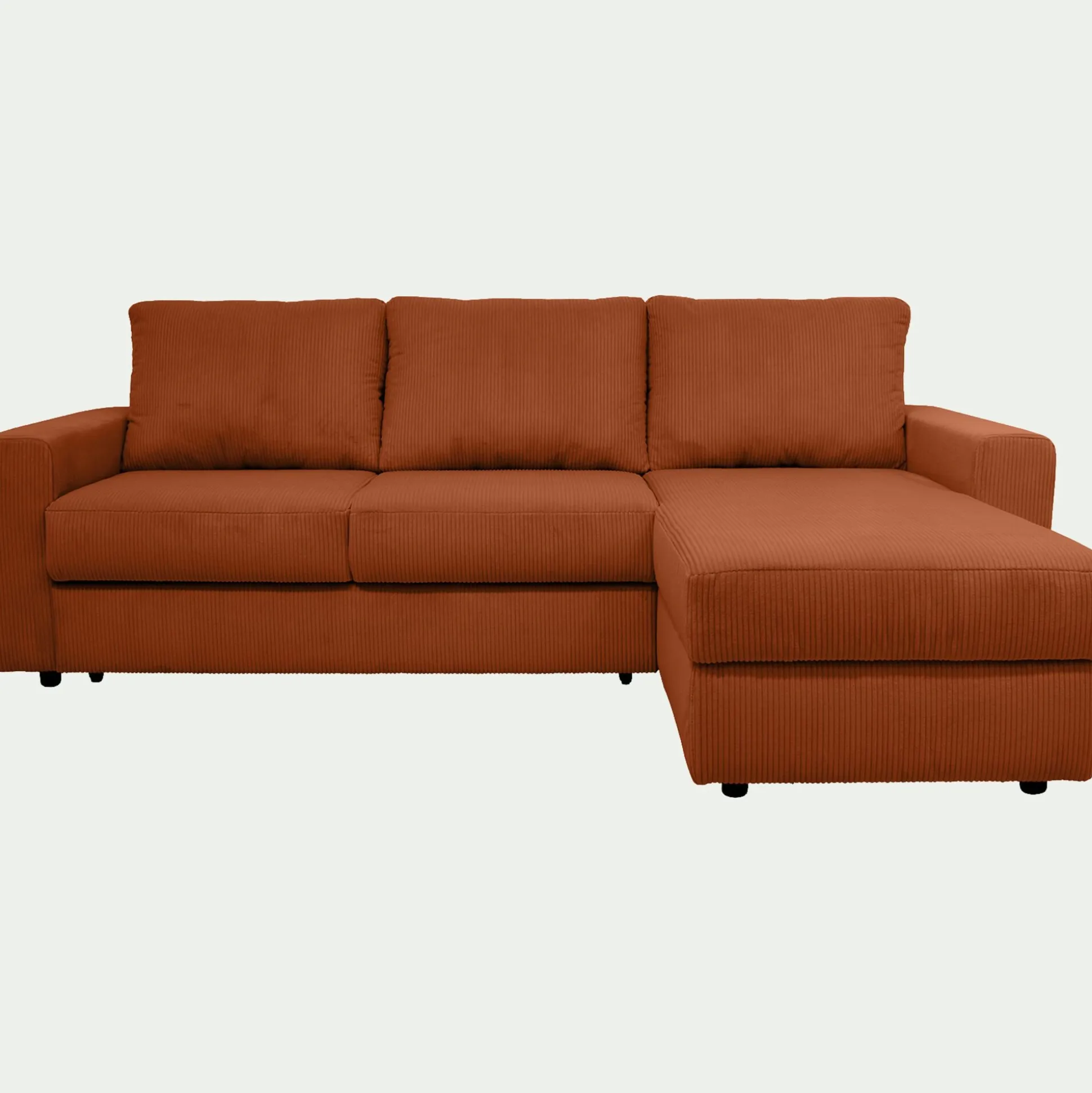 Un élégant canapé d’angle en velours côtelé 4 places pour votre salon. Son coloris brun rustrel apporte une touche de nature méditerranéenne tendance à votre décoration. Un canapé confortable doté d’épais coussins pour une assise d’une grande qualité. Ce canapé s’ouvre facilement et vous permet d’obtenir un lit pour vos convives. Un couchage occasionnel de grande taille, particulièrement utile. Sa méridienne peut être fixée aussi bien à droite qu’à gauche, afin que vous puissiez choisir l’angle. Elle vous offre également un grand coffre de rangement, idéal pour disposer un plaid, des couvertures et des oreillers. Entièrement conçu en France, ce canapé incarne le savoir faire et le charme à la française. Un canapé déco pour se détendre et passer d’agréables moments entre amis ou en famille.