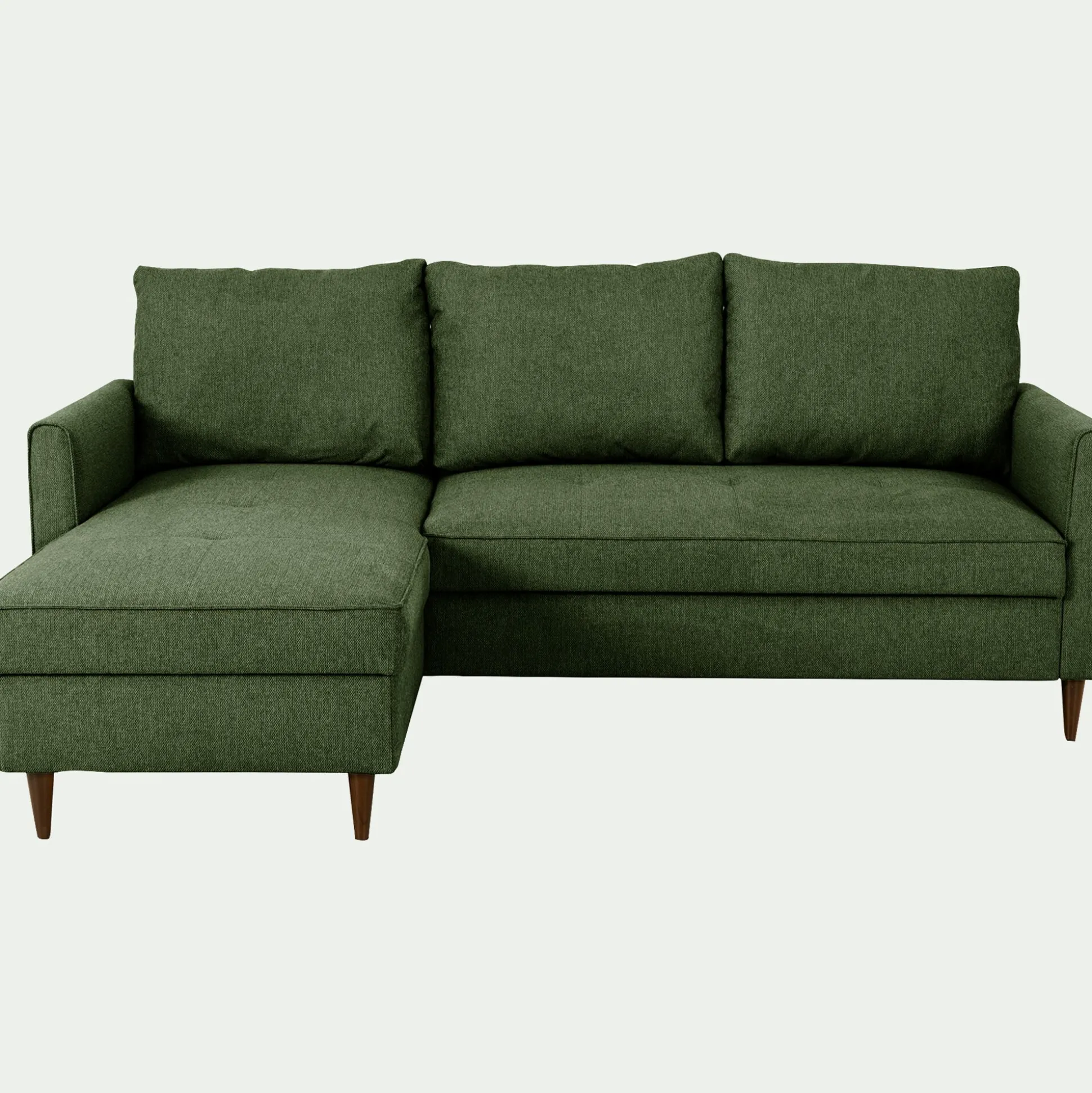 Pensé pour s’adapter à chaque intérieur, ce canapé d’angle réversible permet de choisir l’orientation de son angle, à gauche ou à droite, selon les envies et l’agencement de la pièce. Sa structure en bois accueille une assise en mousse généreuse, complétée par trois coussins de dos qui offrent un soutien optimal aux lombaires et aux épaules. Son revêtement en tissu tramé vert, à la fois profond et naturel, habille ce canapé d’une élégance intemporelle. Non déhoussable, il repose sur des pieds en bois de hêtre qui renforcent son allure chaleureuse et naturelle. Compact avec ces 192 cm de long, ce canapé d’angle 3 places fabriqué en Roumanie est idéal pour conjuguer style et confort au quotidien, même dans un petit salon.