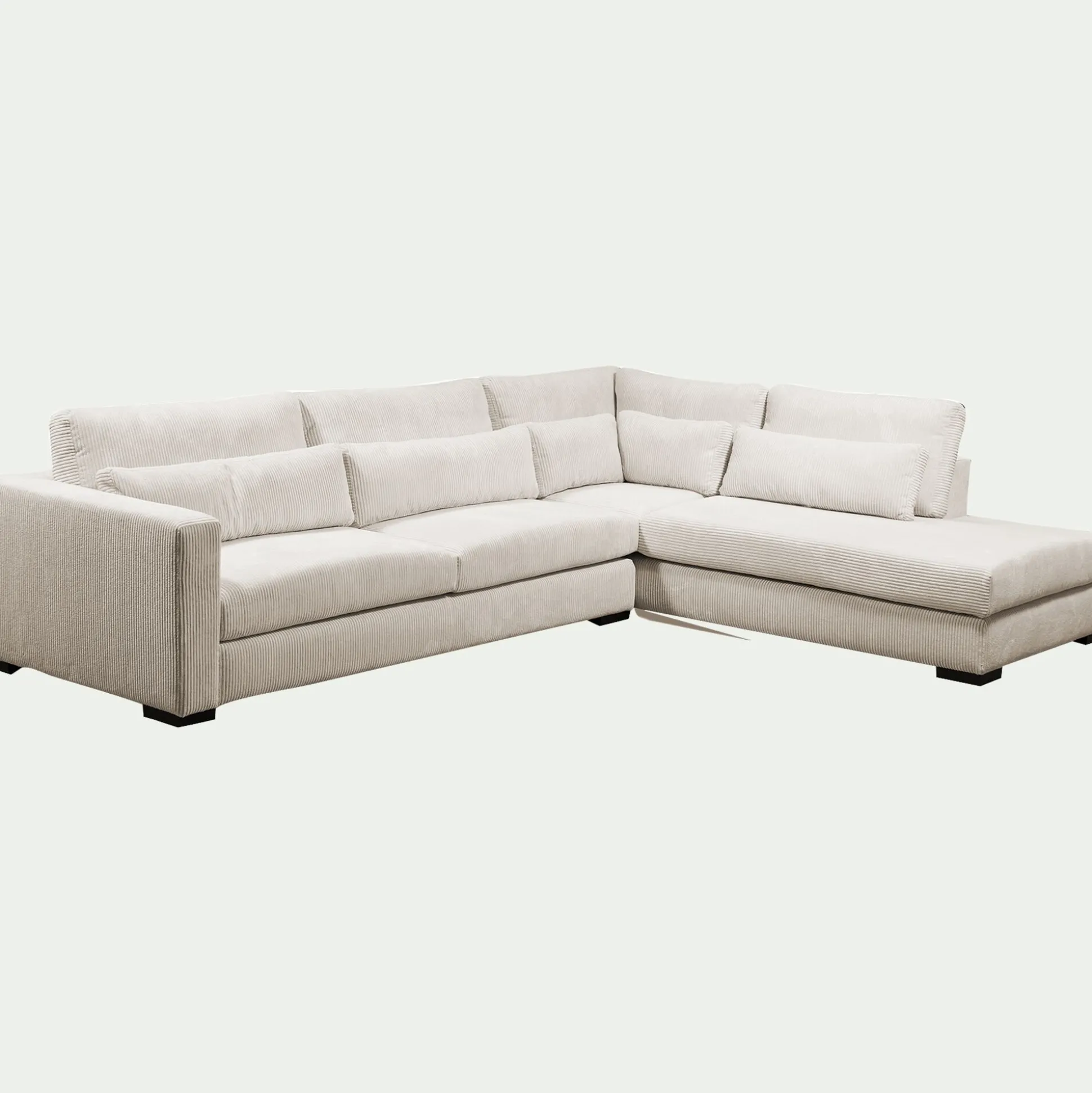Le canapé grand angle droit fixe Batis incarne l’alliance parfaite entre confort et élégance. Sa structure solide en bois massif assure une stabilité et une durabilité exceptionnelles. Revêtu d’un velours côtelé beige, il offre une texture douce et un aspect cocooning. Les coussins déhoussables facilitent l’entretien et permettent de maintenir la fraîcheur du canapé. Avec ses 6 places spacieuses, il offre un espace généreux pour se détendre en toute tranquillité ou pour accueillir confortablement vos invités. Ce canapé d’angle droit en velours allie praticité, confort et esthétique, ajoutant une touche de raffinement à votre salon.