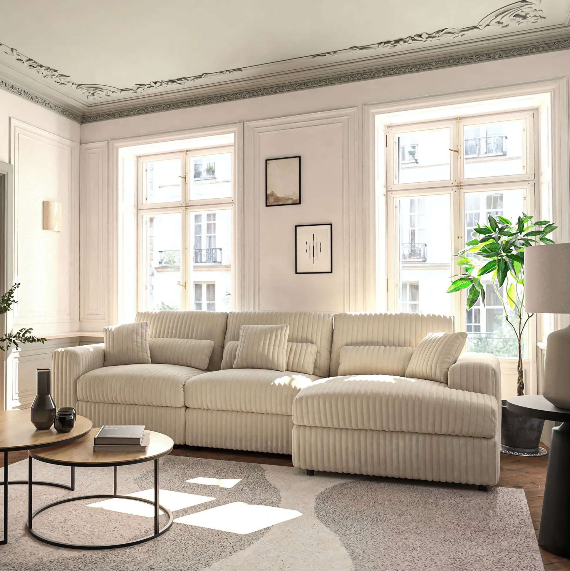 Avec son grand angle à droite, ce canapé d’angle est une invitation aux moments partagés. Son revêtement en velours côtelé, à la fois doux et résistant, enveloppe l’espace d’une chaleur réconfortante. Son coloris blanc ventoux, intemporel, s’harmonise avec tous les styles d’intérieur. Pensé pour le confort, ce canapé fixe se compose d’une assise spacieuse, d’un dossier accueillant et de coussins déhoussables pour un entretien facilité. Des coussins décoratifs viennent parfaire l’ensemble, ajoutant une touche cosy. Un canapé idéal pour des instants de détente en famille ou entre amis.