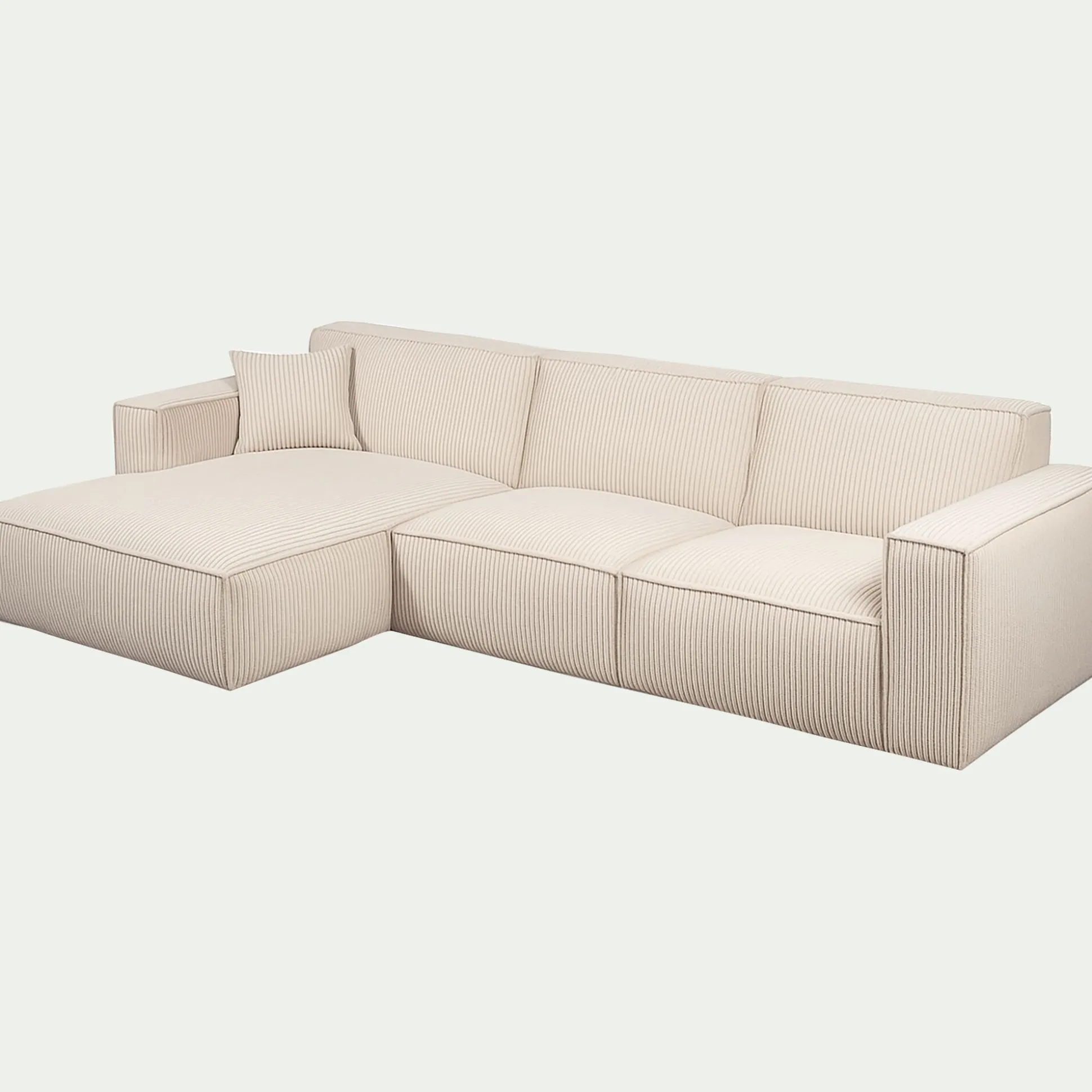 Le canapé d’angle gauche Kubo transformera votre intérieur tout en vous offrant un confort absolu pour vos moments de détente grâce à sa grande méridienne. Ses lignes rectangulaires confèrent une touche de modernité à votre salon, ajoutant une note contemporaine à votre décoration. Conçu en Ukraine, ce canapé fixe allie qualité et savoir-faire. Son assise généreuse et moelleuse vous permettra d’accueillir famille et amis pour des moments de partage conviviaux. Revêtu d’un velours côtelé dans notre coloris beige, il adoucit votre pièce pour une ambiance chic et actuelle.