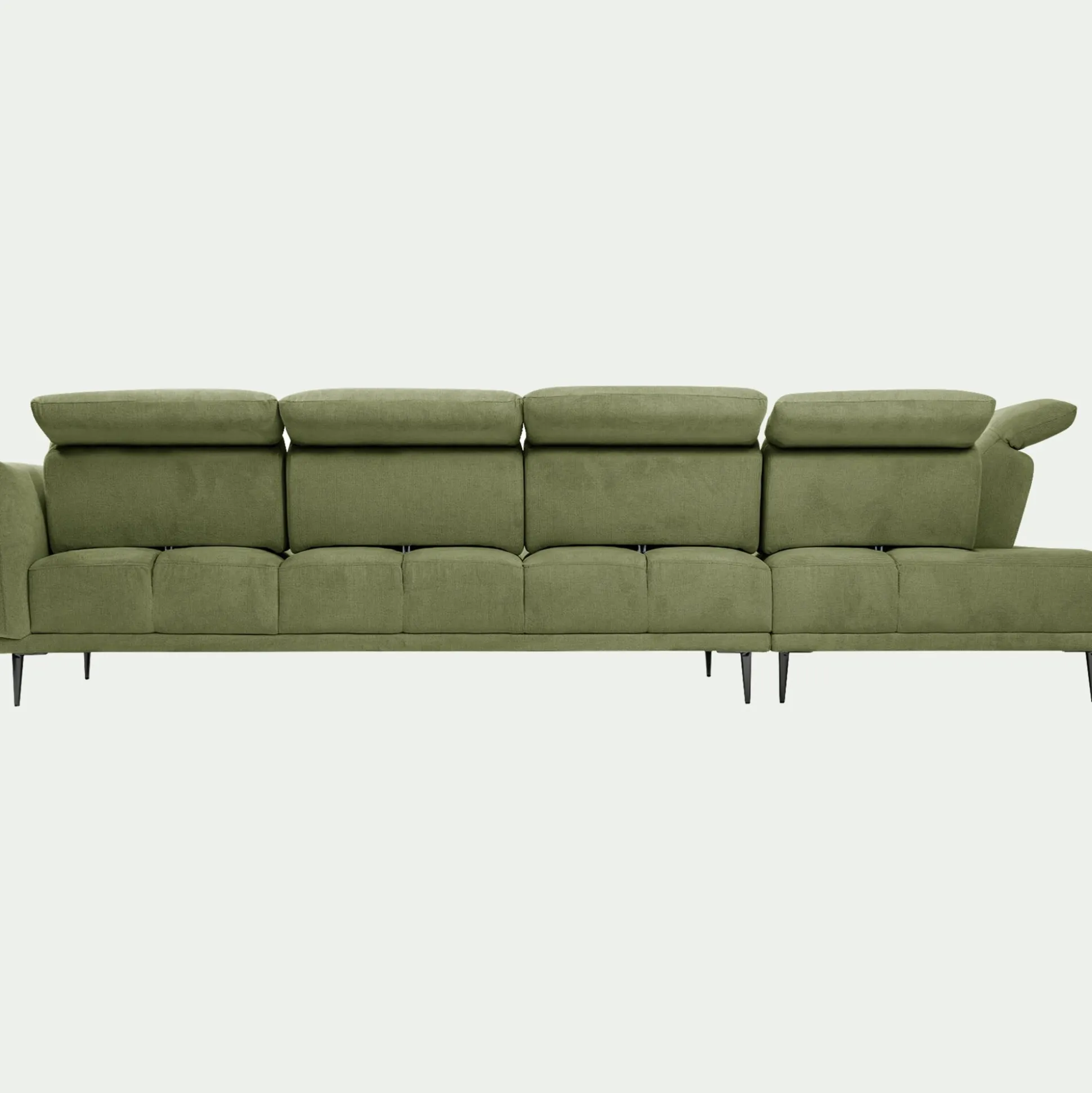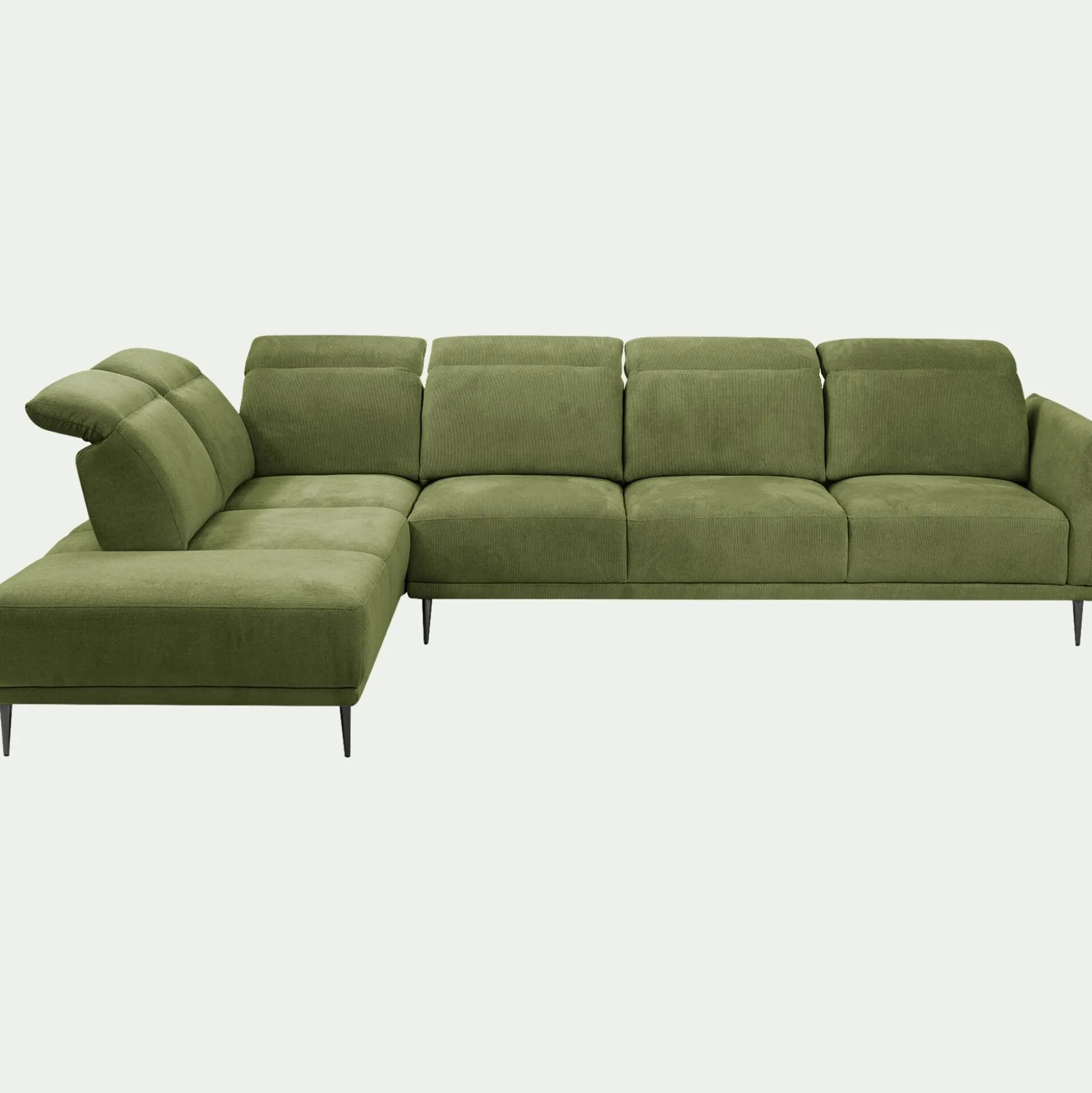 Optez pour ce canapé d’angle gauhe 5 places qui allie un design contemporain à une fonctionnalité ingénieuse. Son revêtement en tissu memphis vert cèdre apporte une touche lumineuse et audacieuse à votre salon. Profitez d’un confort sur mesure grâce à son assise profonde et à son système de dossiers qui reculent pour s’adapter à vos envies. Les têtières relevables offrent un soutien optimal pour vos moments de détente devant la télévision ou un bon livre. Ce canapé est une pièce maîtresse qui séduit par sa qualité de fabrication et son allure résolument moderne.