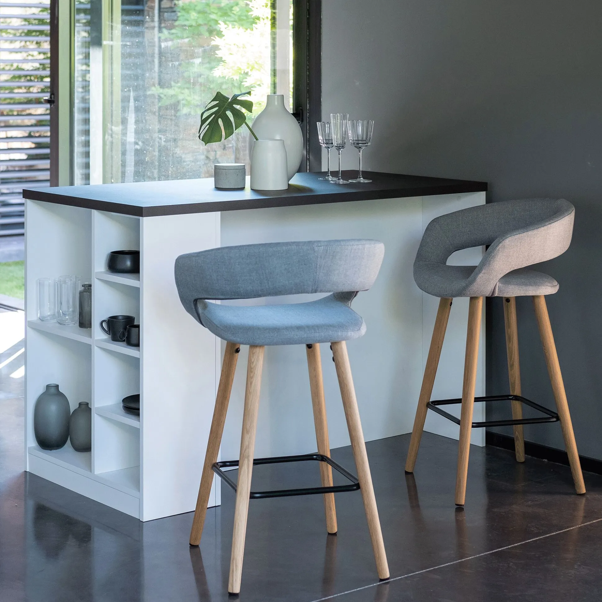 Le tabouret haut Joyau offre un style moderne et indémodable qui donne une élégance incomparable. Son confort est prouvé par son assise en mousse de 26kg/m3 et d’harmonieux accoudoirs. Son piétement en chêne massif noir mat et son doux tissu gris en font un partenaire idéal pour vos moments de convivialité autour du bar. Vous trouverez dans la même gamme les chaises assorties.