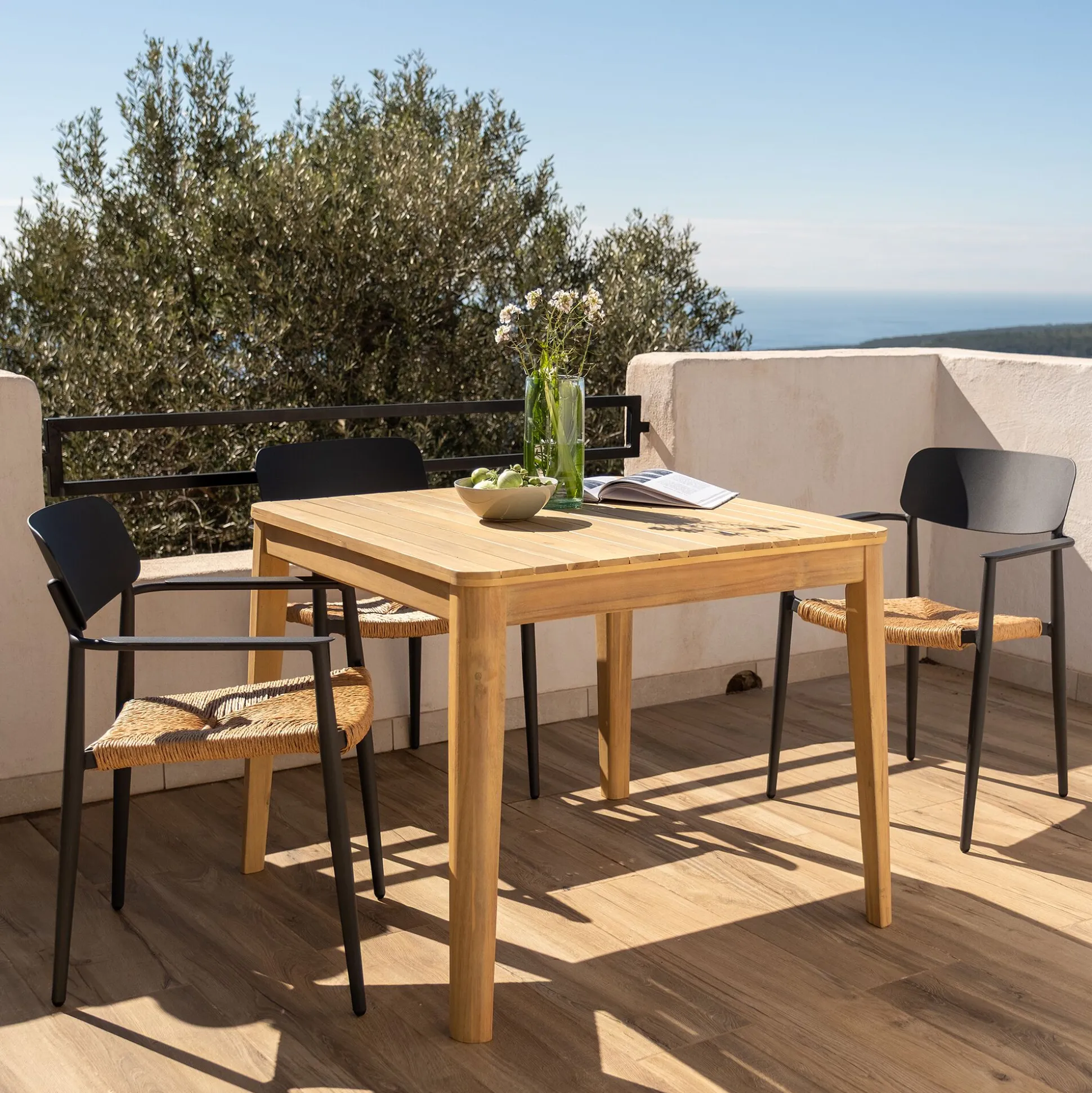 Pieds fuselés et siège en résine tressée.