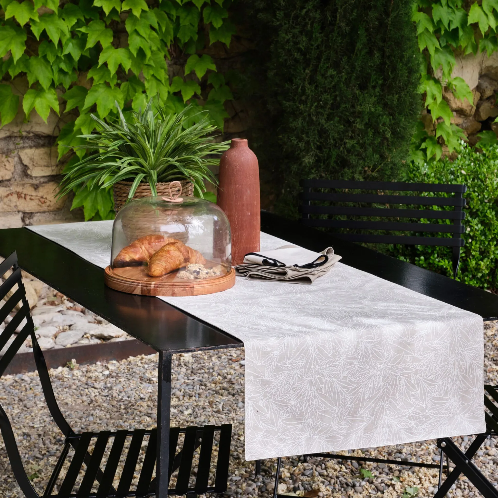 Le chemin de table est une bande de tissu décorative qui permet de mettre votre table sur son 31. Cet accessoire de l’art de la table vient protéger votre meuble tout en donnant une allure distinguée à l’ensemble. Confectionné en coton, ce chemin de table beige arbore un motif floral : des feuilles de laurier viennent habiller la toile et lui insuffler un charme méditerranéen.