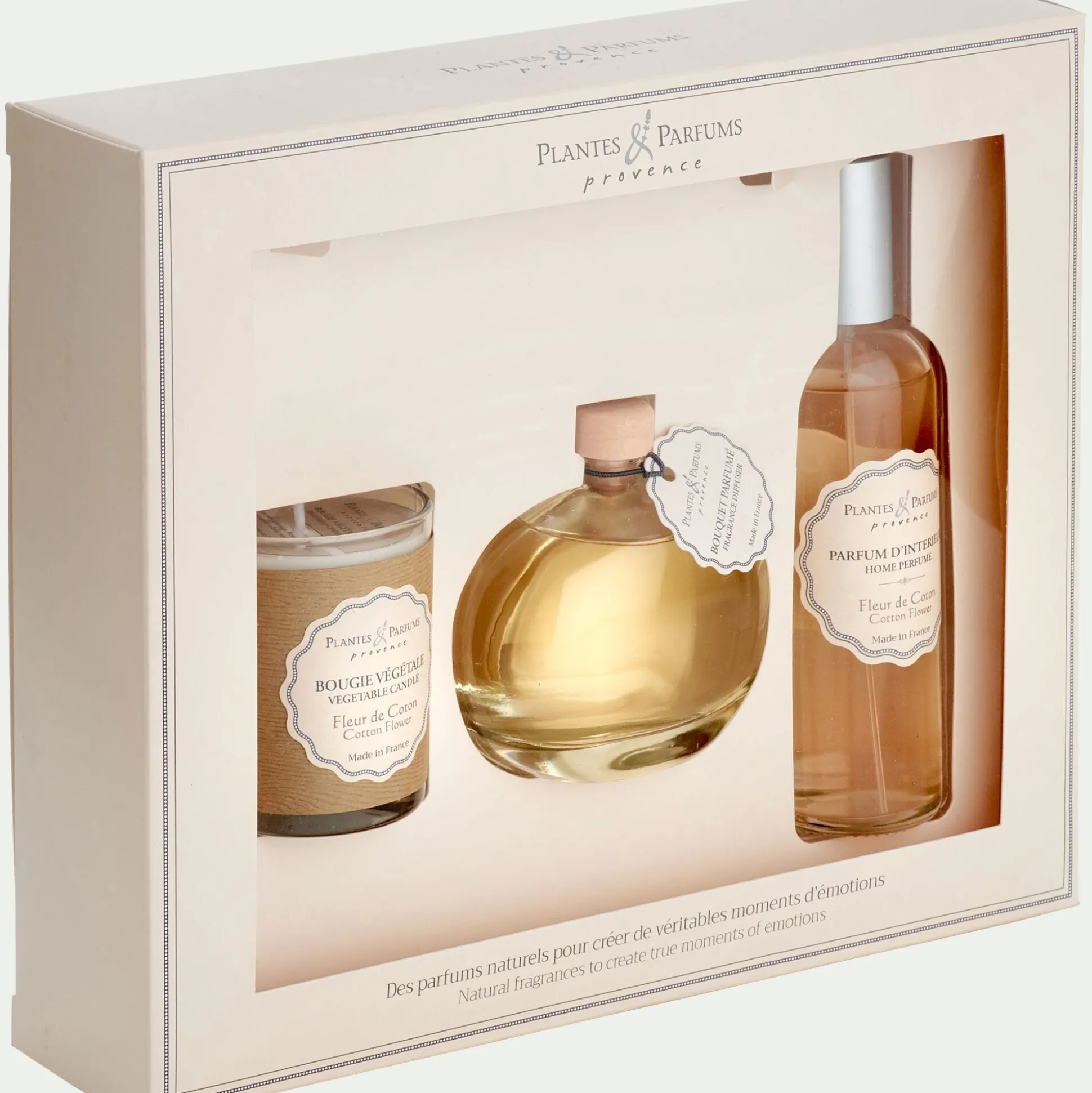 A offrir à un proche ou à vous-même, ce coffret parfumé réunit les indispensables : une bougie 75g, un bouquet parfumé et un parfum d’intérieur à la fleur de coton.