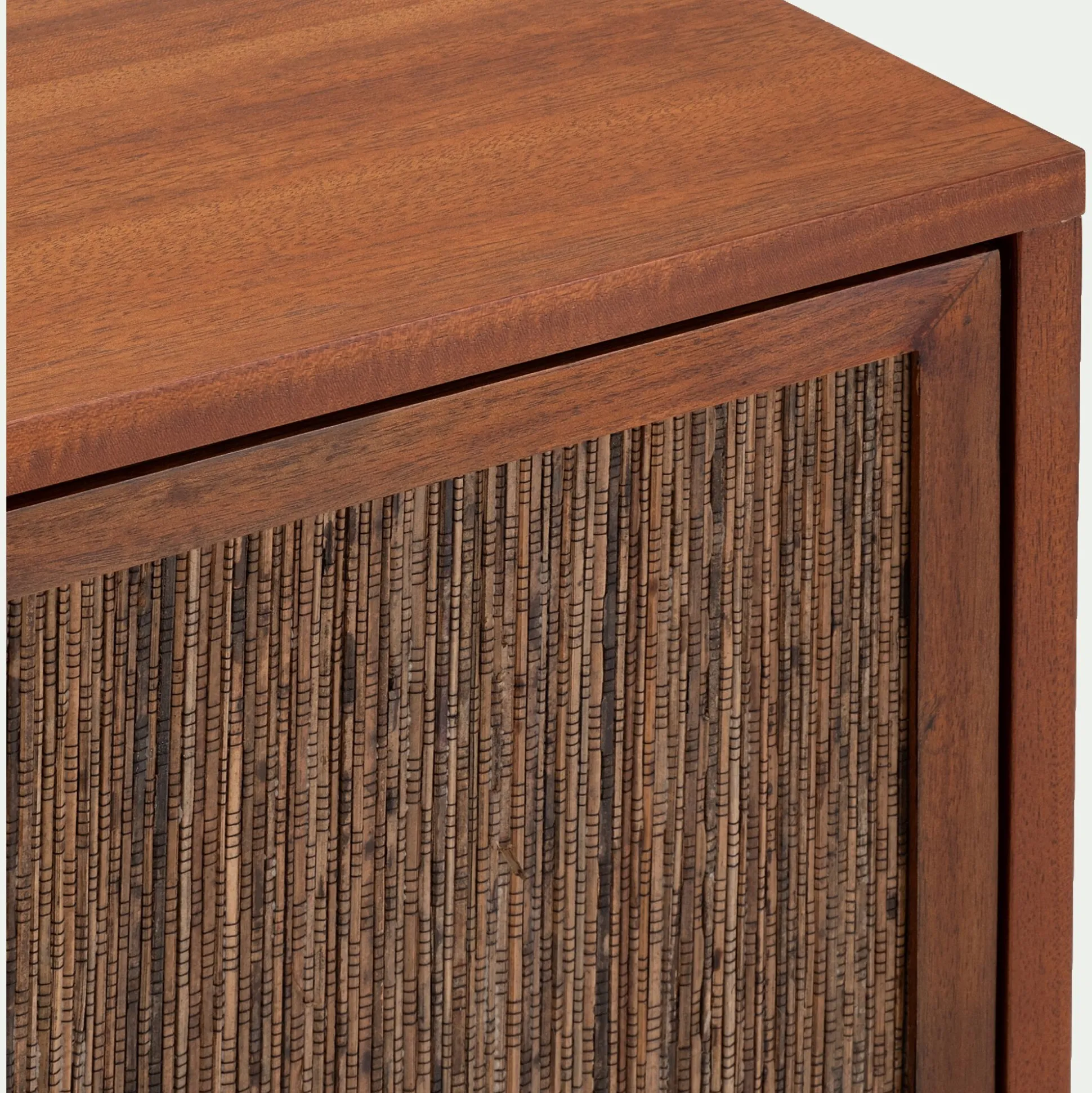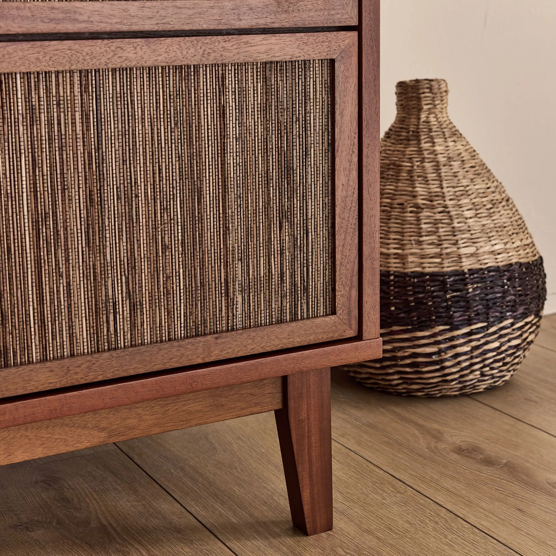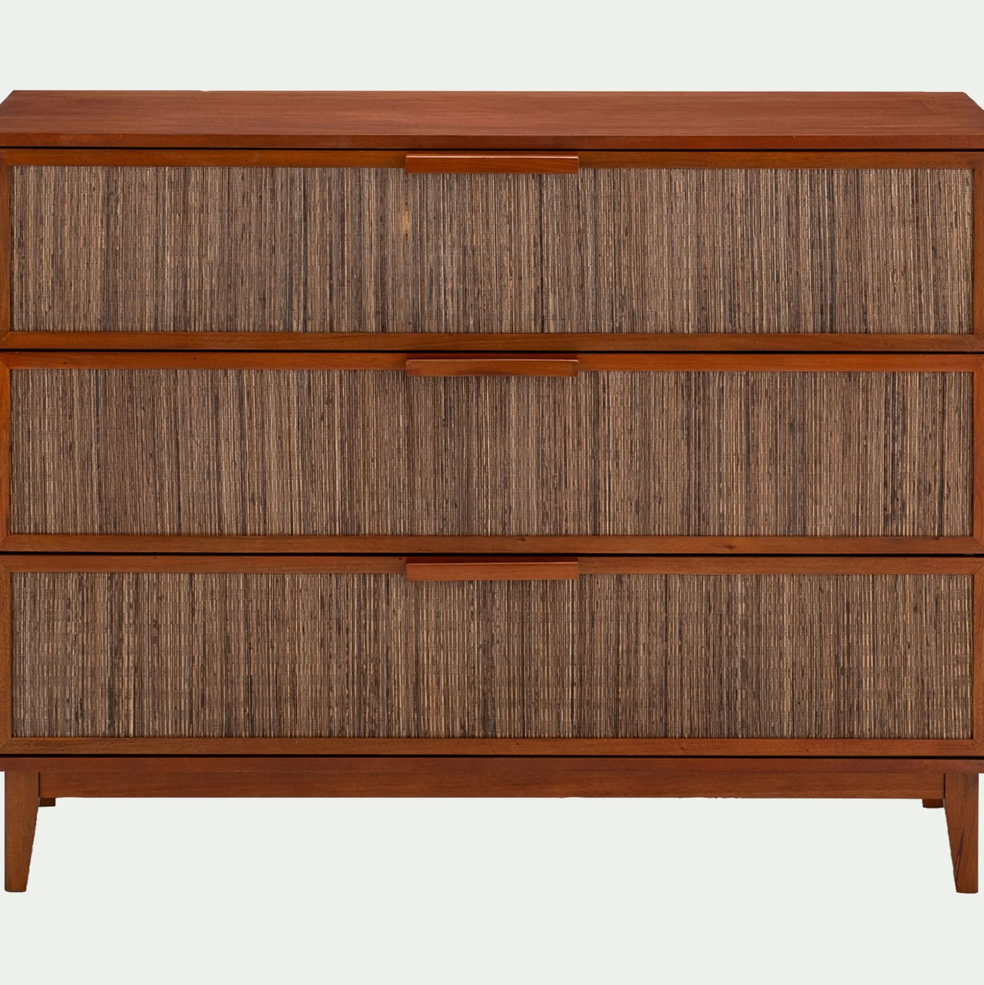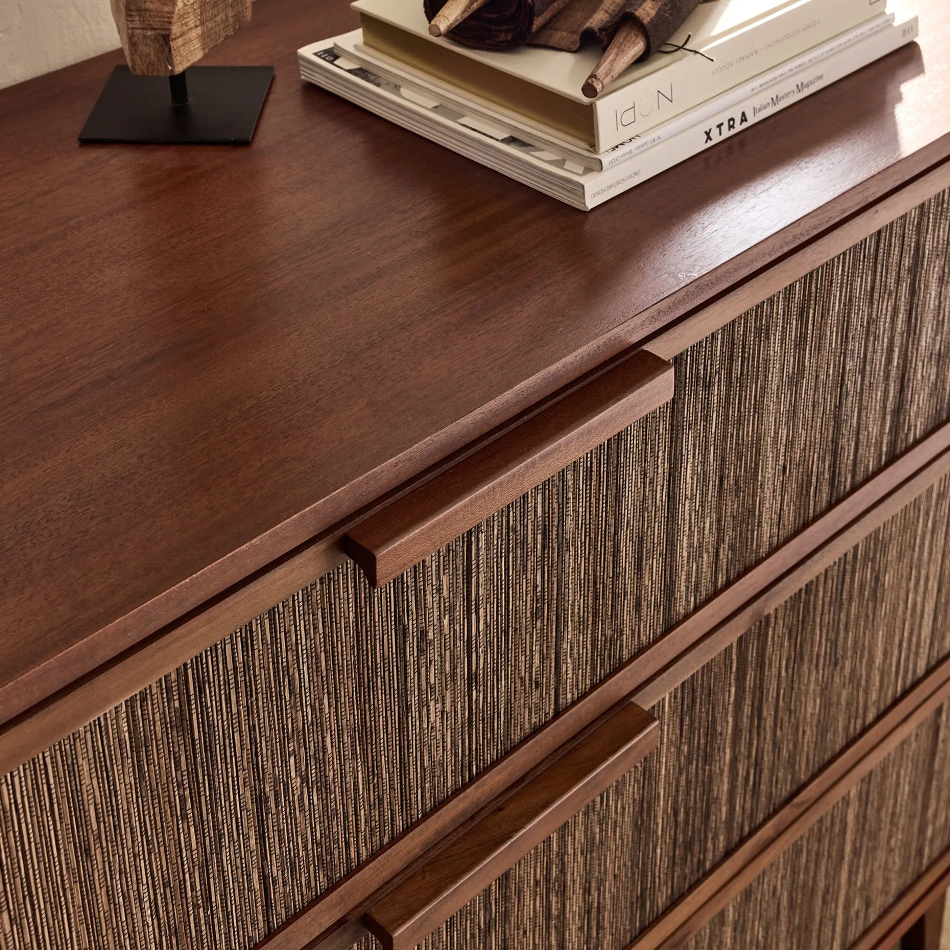 Structure en acajou massif et MDF placage acajou, facade de tiroir recouvert de fibre de Coco, finition vernis cellulosique, pietement bois massif, finition interieure MDF melamine.