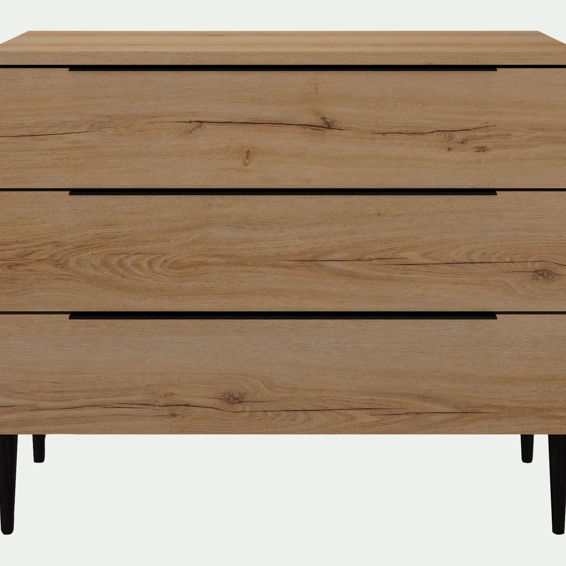 Pour une chambre bien rangée et décorée, faites le choix d’une commode en bois. Ce meuble intemporel permet de mieux ordonner l’espace en triant et classant vos accessoires. Cette commode en bois comporte 3 tiroirs de rangement avec freins intégrés. Ces derniers s’ouvrent à l’aide de poignées noires en aluminium, détail moderne qui apporte de l’élégance à ce meuble de rangement aux accents rustiques. Fabriquée en France, cette commode s’associe au reste de la gamme Lucian pour une pièce harmonieuse.
