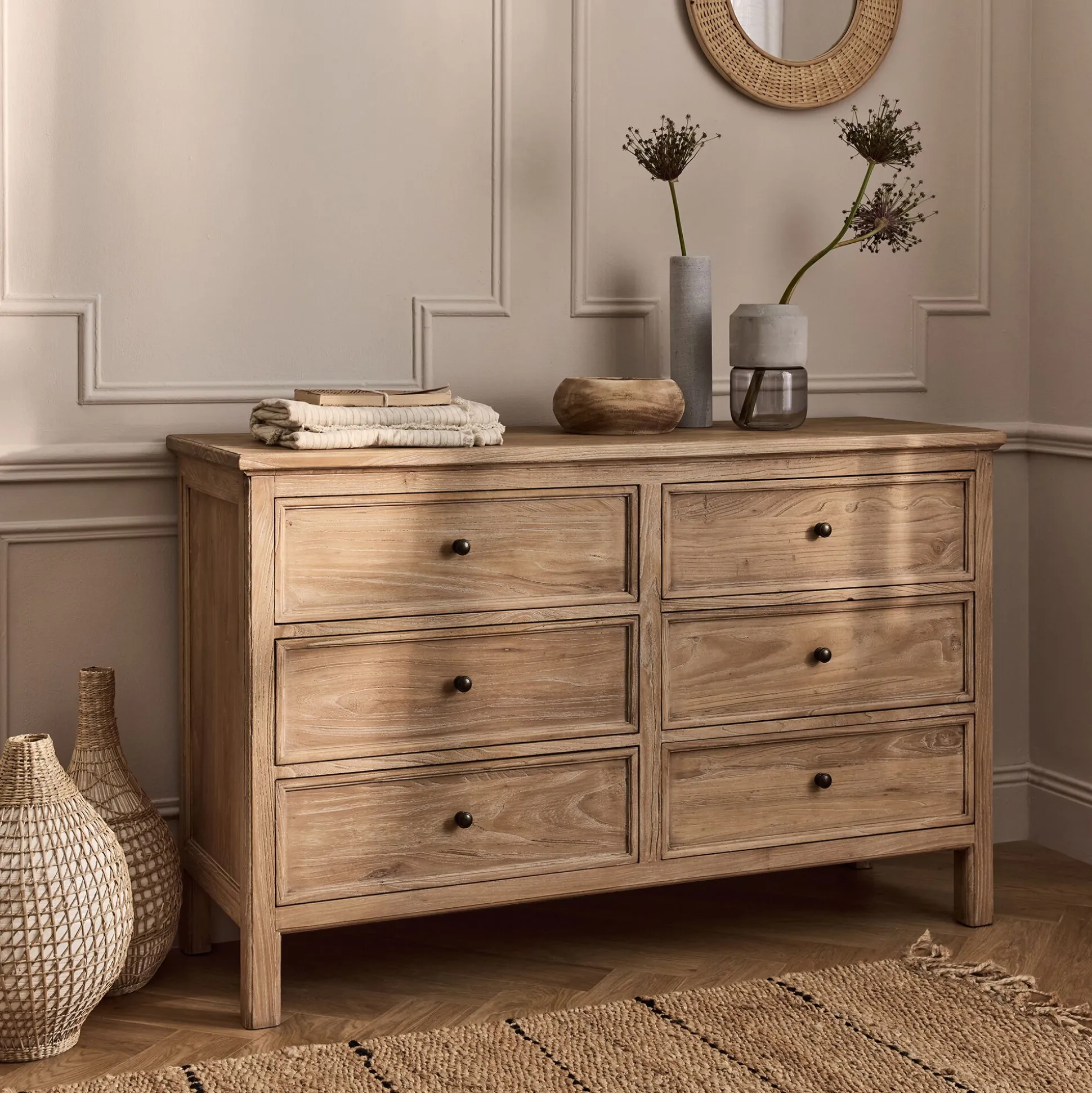 Avec ses dimensions généreuses – 140 cm de long pour 88 cm de haut – la commode Alysse offre un grand espace de rangement réparti sur 6 tiroirs. Fabriquée en bois d’orme et de pin, elle conserve un charme rustique avec ses moulures délicates et son allure chaleureuse. Parfaite pour une chambre spacieuse, elle associe esthétique classique et fonctionnalité au quotidien.