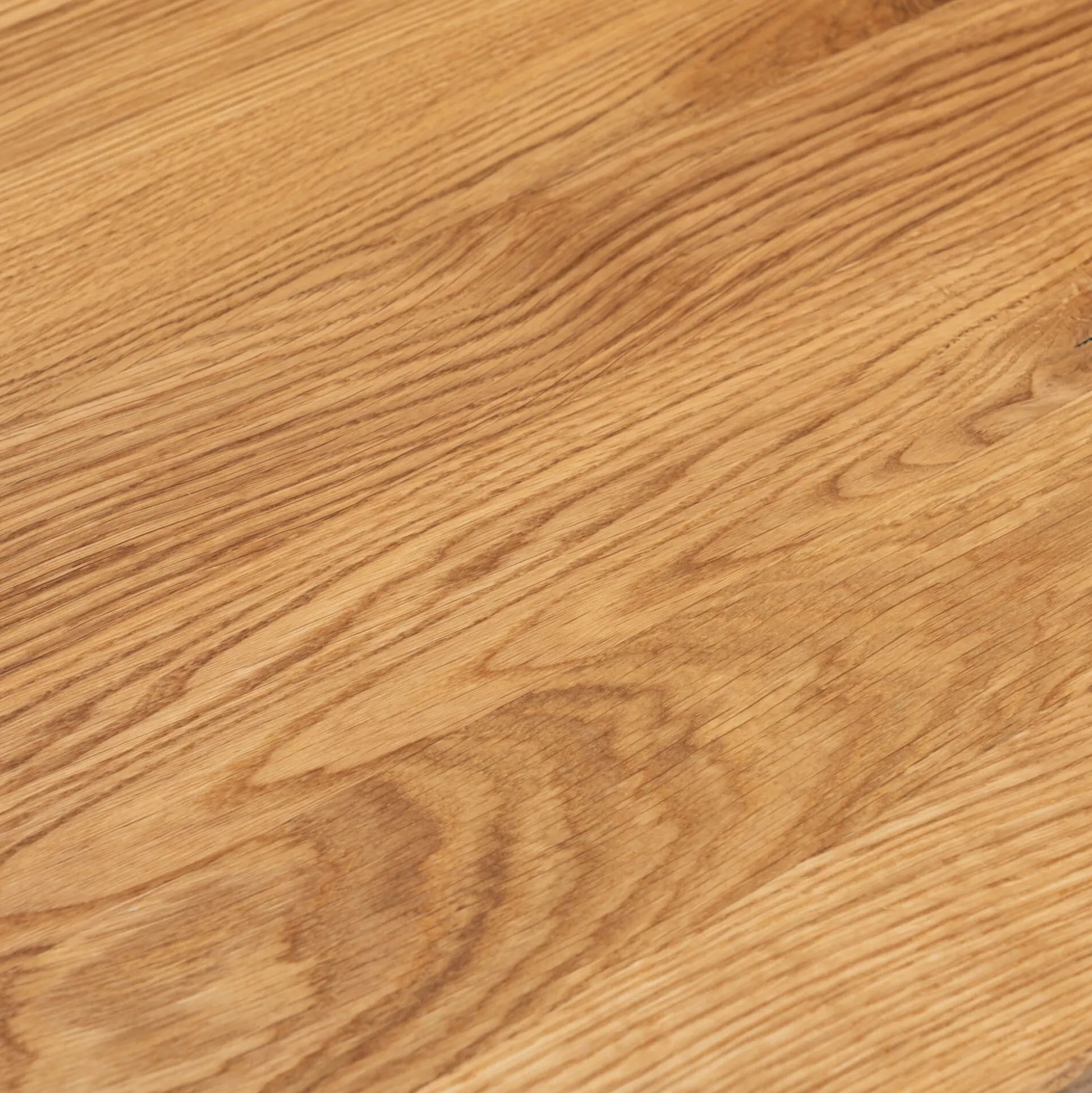 Structure en chêne massif, fond et fonds de tiroirs en panneau de particules décor chêne.