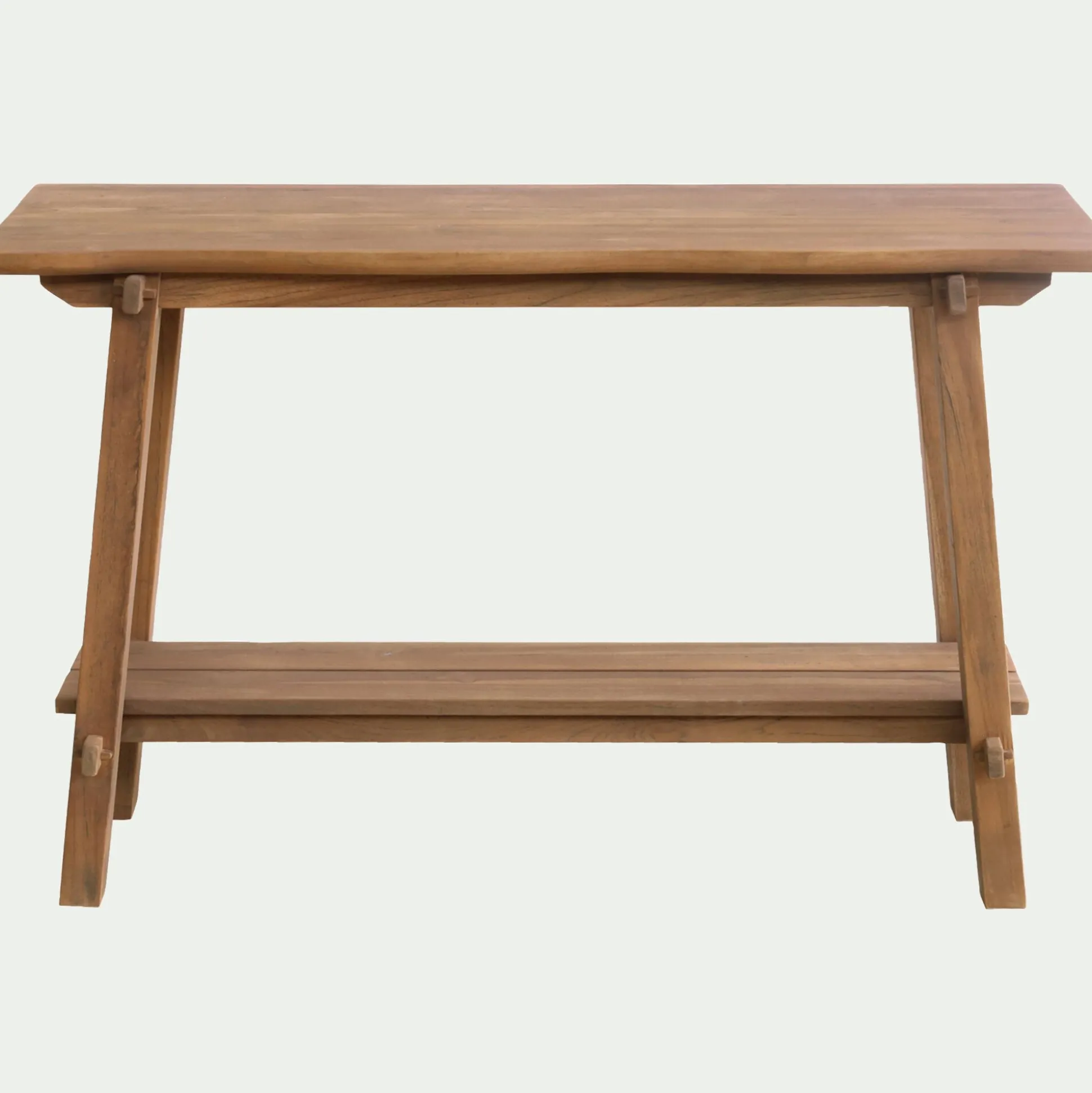La console Meyrargues allie authenticité et fonctionnalité. Fabriquée en teck recyclé certifié FSC, elle mesure 125 cm de long pour une silhouette étroite, idéale dans une entrée ou un couloir. Son plateau supérieur accueille décorations ou objets du quotidien, tandis que le plateau inférieur offre un espace pratique pour ranger boîtes ou paniers. Un meuble à la fois élégant et utile.