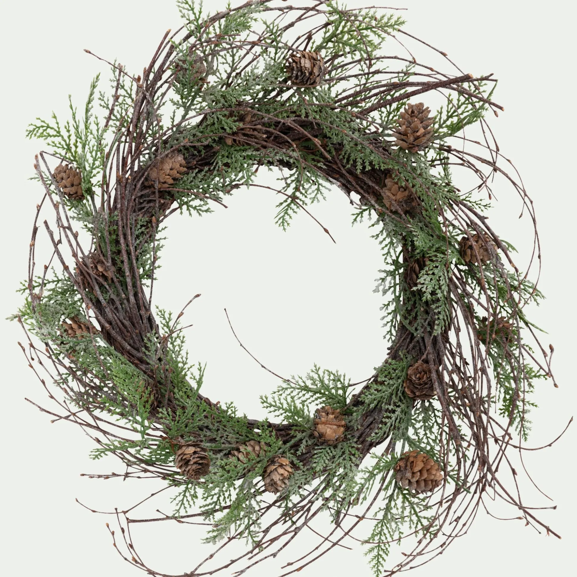 Cette couronne de Noël naturelle se distingue par sa composition. De véritables pommes de pin se succèdent pour former cette couronne épaisse et authentique. Alors que certaines pignes gardent leur couleur naturelle, d’autres sont blanches pour évoquer le givre hivernal. Un détail déco qui s’accorde parfaitement à la saison de Noël. Cette couronne naturelle apportera du cachet à l’embrassure de votre porte ou à votre chemin de table.
