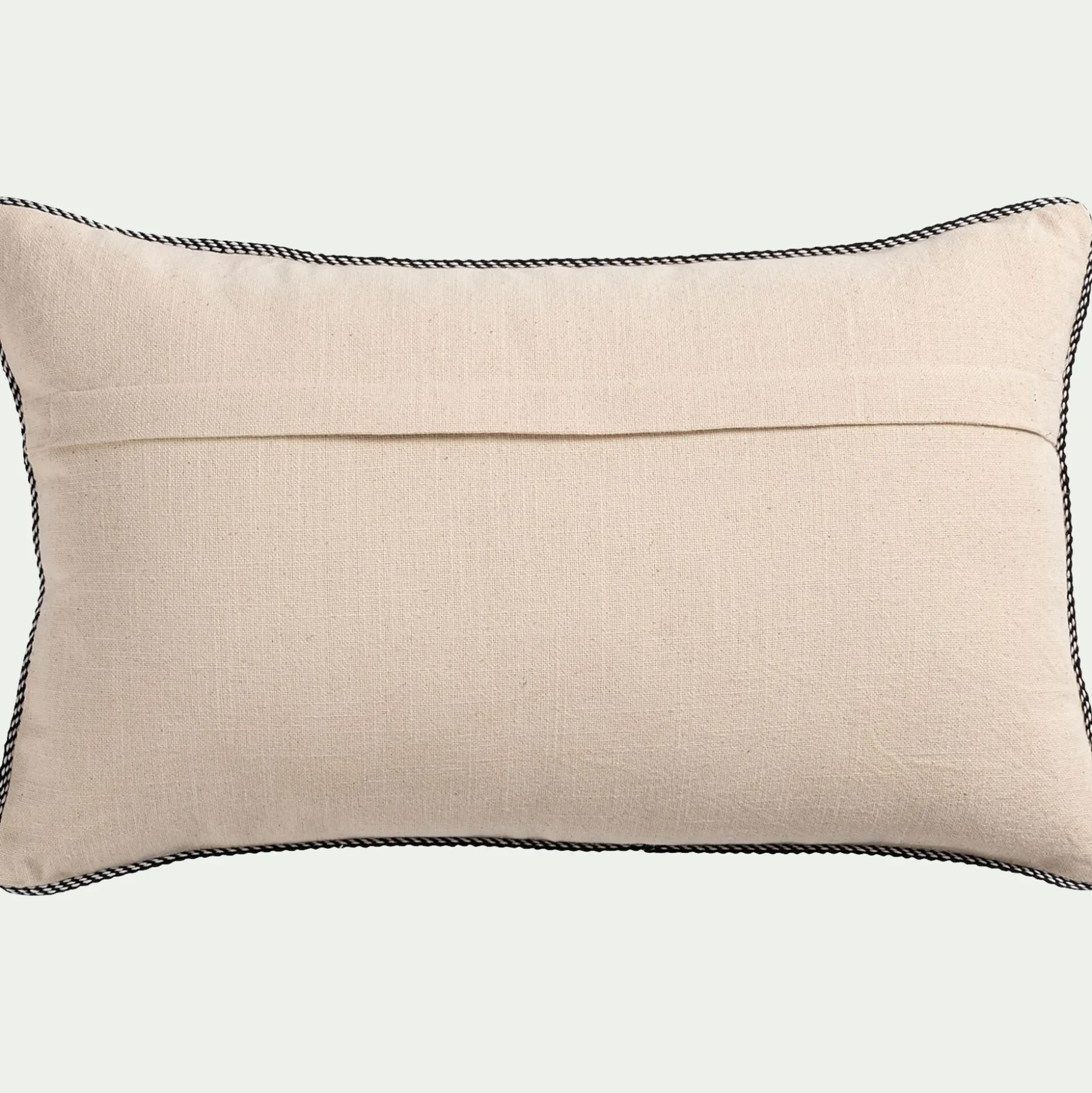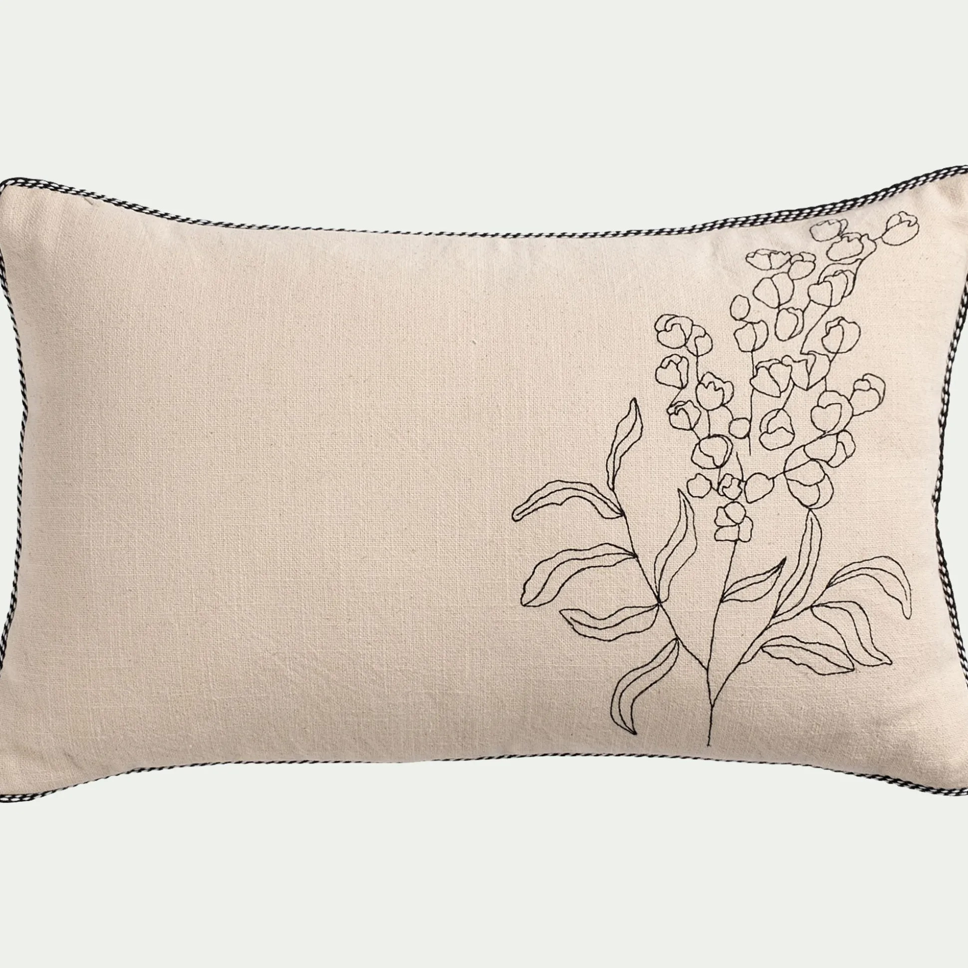 Le coussin Lilane mise sur la délicatesse des détails et l’élégance naturelle des matières. Rectangulaire (30×50 cm), il est habillé d’une housse en coton Oeko-Tex non teinté, qui laisse apparaître la couleur brute de la fibre. Un motif floral brodé en noir vient se poser sur ce fond neutre, créant un contraste raffiné et intemporel. Le tout est souligné par une finition passepoil qui encadre joliment la silhouette du coussin.