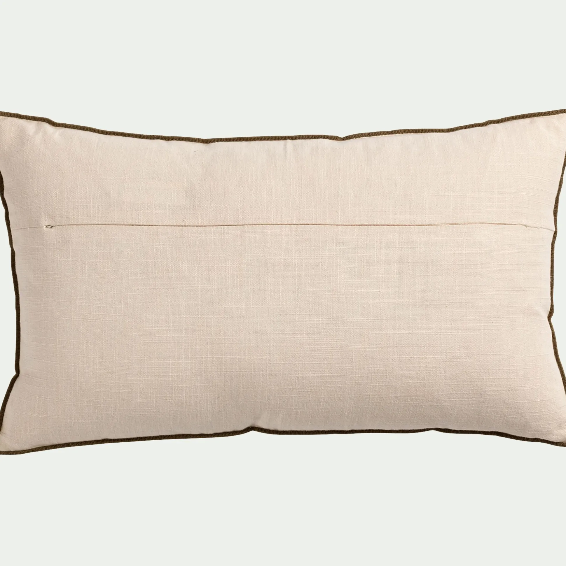 Ce coussin rectangulaire (30×50 cm) apporte une touche fraîche et joyeuse à la déco du canapé. Confectionné en coton naturel, il est orné de petites fleurs jaunes brodées qui évoquent les champs ensoleillés. Un passepoil vert souligne ses contours et ajoute un joli liseré, à la fois discret et plein de caractère. Une alliance de douceur et de nature pour une atmosphère lumineuse et apaisante dans le salon.