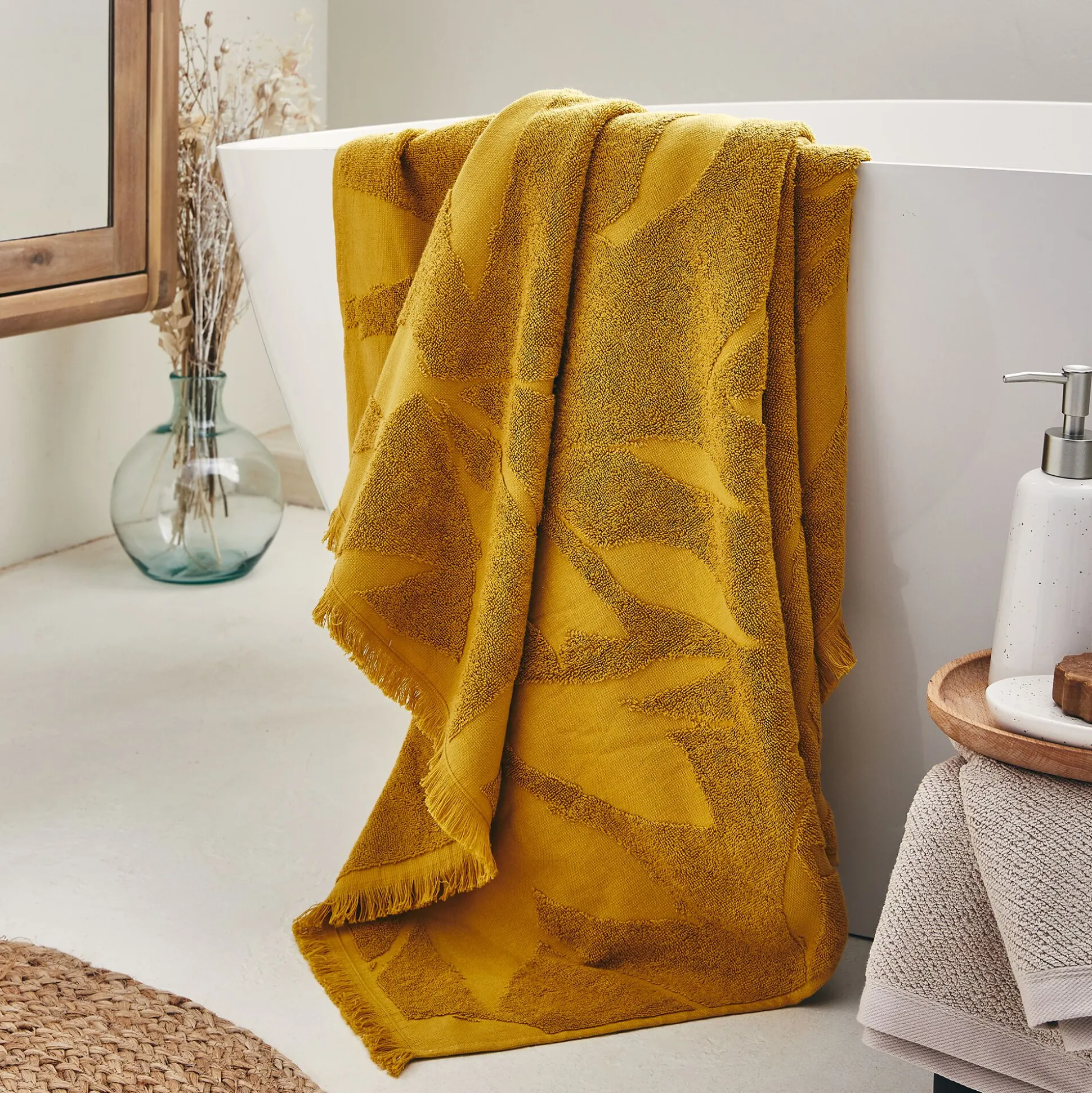 Ce drap de bain 100×150 cm vous enveloppera de douceur chaque jour après le bain ou la douche. Avec son coloris jaune argan ce linge de toilette donnera une touche de couleur tout en réchauffant l’atmosphère de la pièce d’eau. Composée à 100% de coton et fabriquée au Portugal, cette grande serviette de qualité est très agréable au contact de la peau. Vous pourrez la compléter avec d’autres produits de la gamme Ryad comme la serviette de toilette ou le tapis de bain disponible également en jaune argan par exemple. Enveloppez-vous dans ce drap de bain et savourez un pur moment de relaxation et de bien-être au quotidien.
