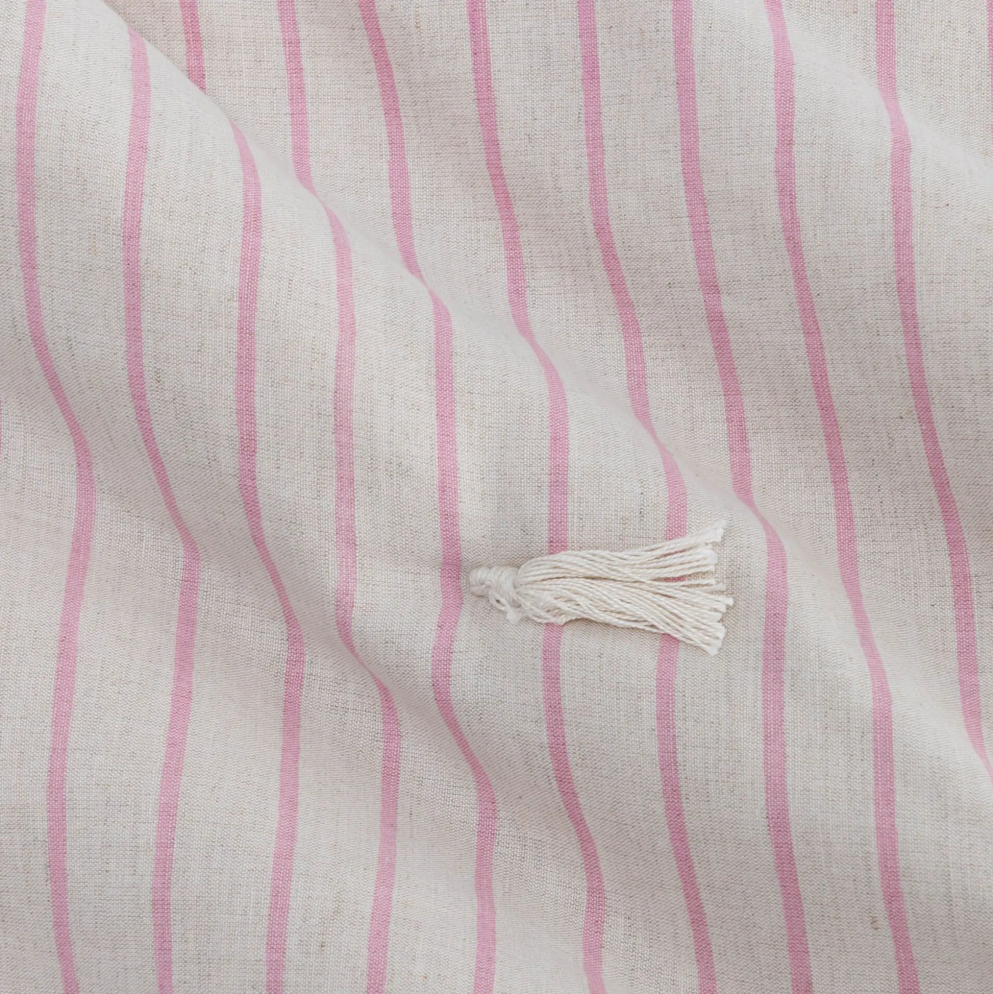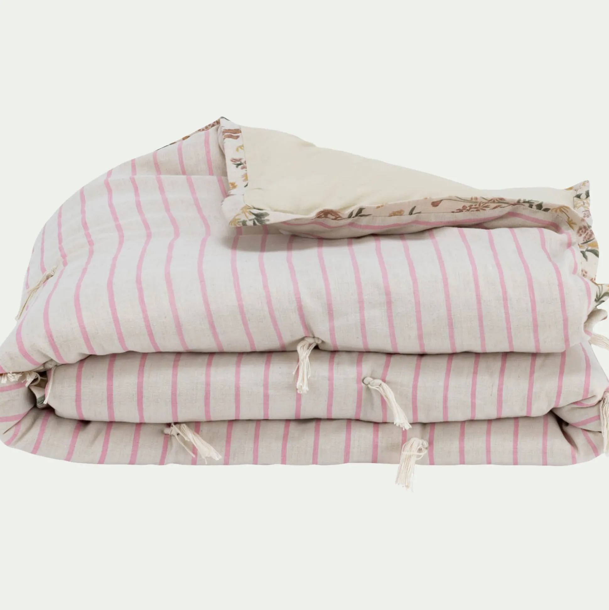Apportez une touche décorative et cosy à votre chambre à coucher avec cet édredon de 100×180 cm. Placé sur le lit, il ajoute du volume et du confort tout en insufflant une ambiance douce et joyeuse. Son recto arbore de charmantes rayures roses, tandis que son verso uni est délicatement rehaussé de petites fleurs sur les bords. Confectionné principalement en coton, il se distingue également par une élégante finition ornée de pompons.