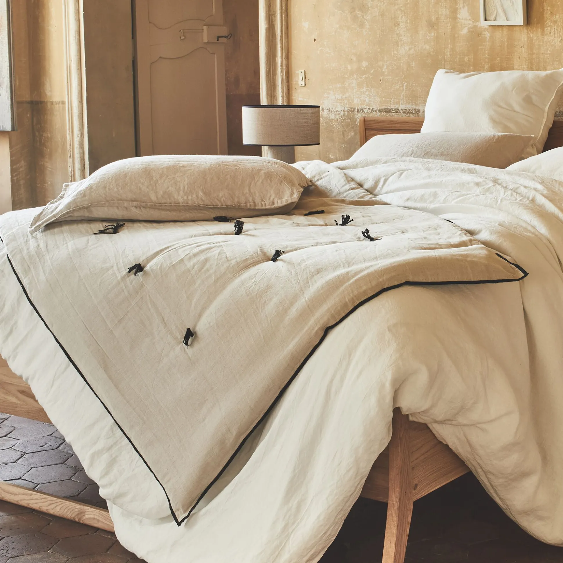 L’édredon Elina, d’un blanc écru naturel et lumineux, est un accessoire incontournable lorsque l’on souhaite se créer un coin douillet. Tissé en coton et lin, cet édredon apportera à la fois une touche déco à votre lit ainsi qu’un peu de chaleur durant les nuits d’hiver. Moelleux et confortable, cet édredon dispose d’un gonflant inimitable grâce à ses 5cm d’épaisseur. Invitation à la paresse, sa robe blanche arbore des détails en passepoil noirs : une garniture en relief située sur les bordures pour souligner les traits de l’édredon. Ce fin liseré est accompagné de quelques pompons noirs pour une touche fantaisiste et bohème qui apporte contraste et caractère à cet édredon blanc.