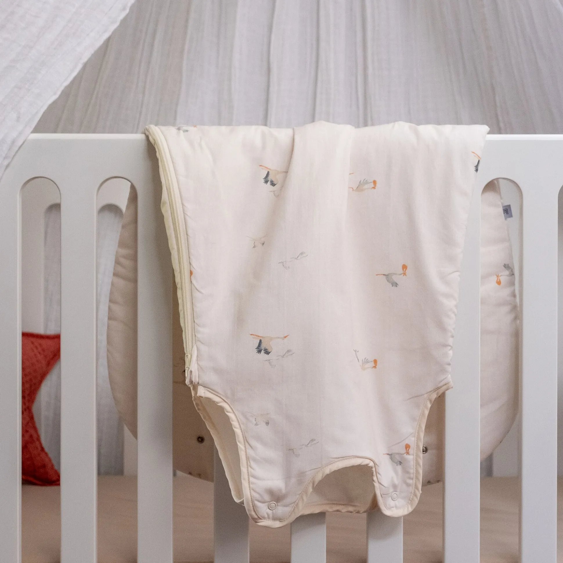 Envol est une collection aérienne et pleine de douceur, qui accompagne les premiers instants avec poésie et sérénité. Portée par le vol gracieux des cigognes, elle s’inspire du ciel et des nuages pour créer un univers apaisant et plein de tendresse.