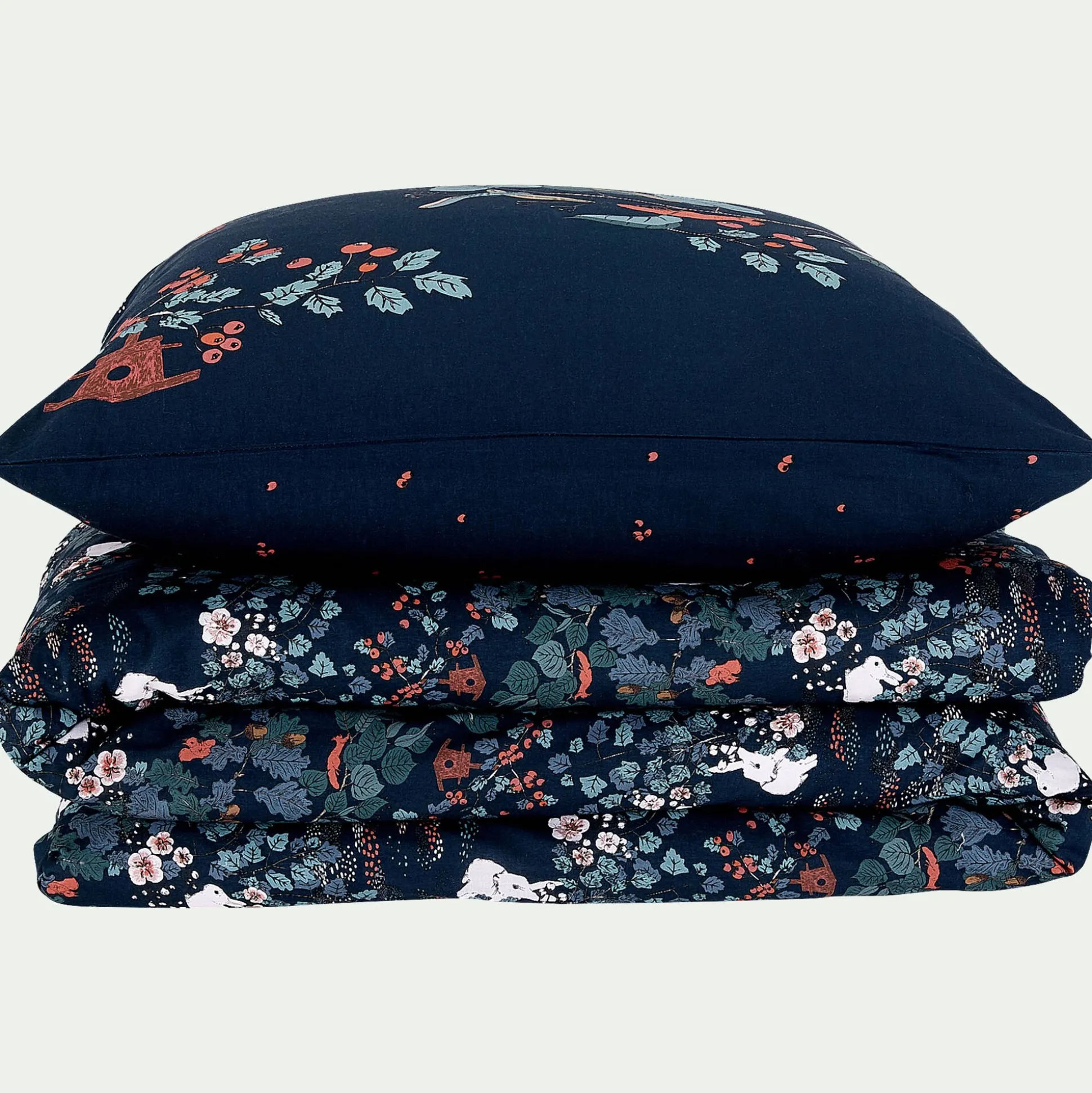 Cette parure de lit transportera votre enfant au coeur de la forêt au milieu d’êtres minuscules et d’animaux espiègles. Le motif de la housse de couette, inspiré d’une tapisserie des années 50, emmène dans le végétal pour rappeler les sous-bois à la lueur du soir. Réversible, l’histoire se poursuit au verso avec des motifs plus doux, plus léger. La décoration de chambre de votre marmot sera mise en valeur grâce à cette housse de couette et la taie d’oreiller pour une déco élégante.