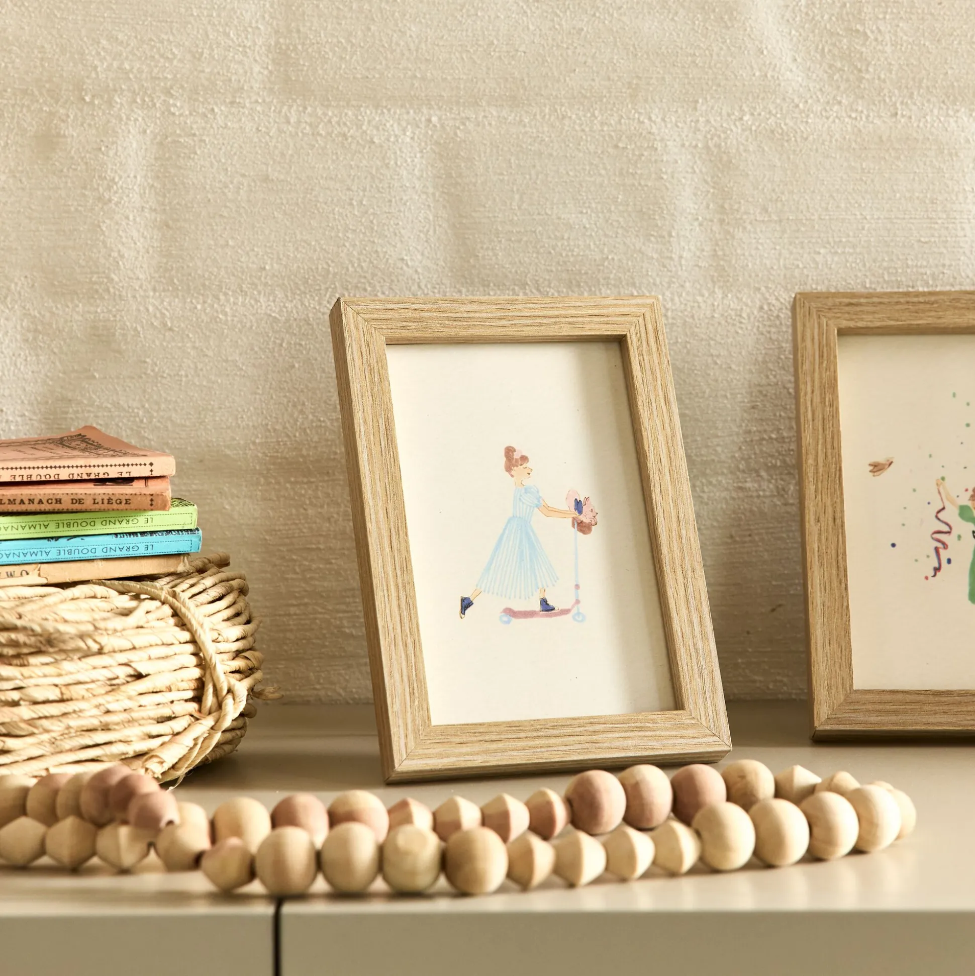Dans ce cadre en bois de 12×17 cm, une scène pleine de vie prend place derrière le verre : une fillette en robe à rayures bleues file joyeusement sur sa trottinette, son chiot bien installé dans le panier, la truffe au vent. À suspendre ou à poser, cette décoration tendre et pétillante apportera une touche d’insouciance et de gaieté à la chambre enfant.