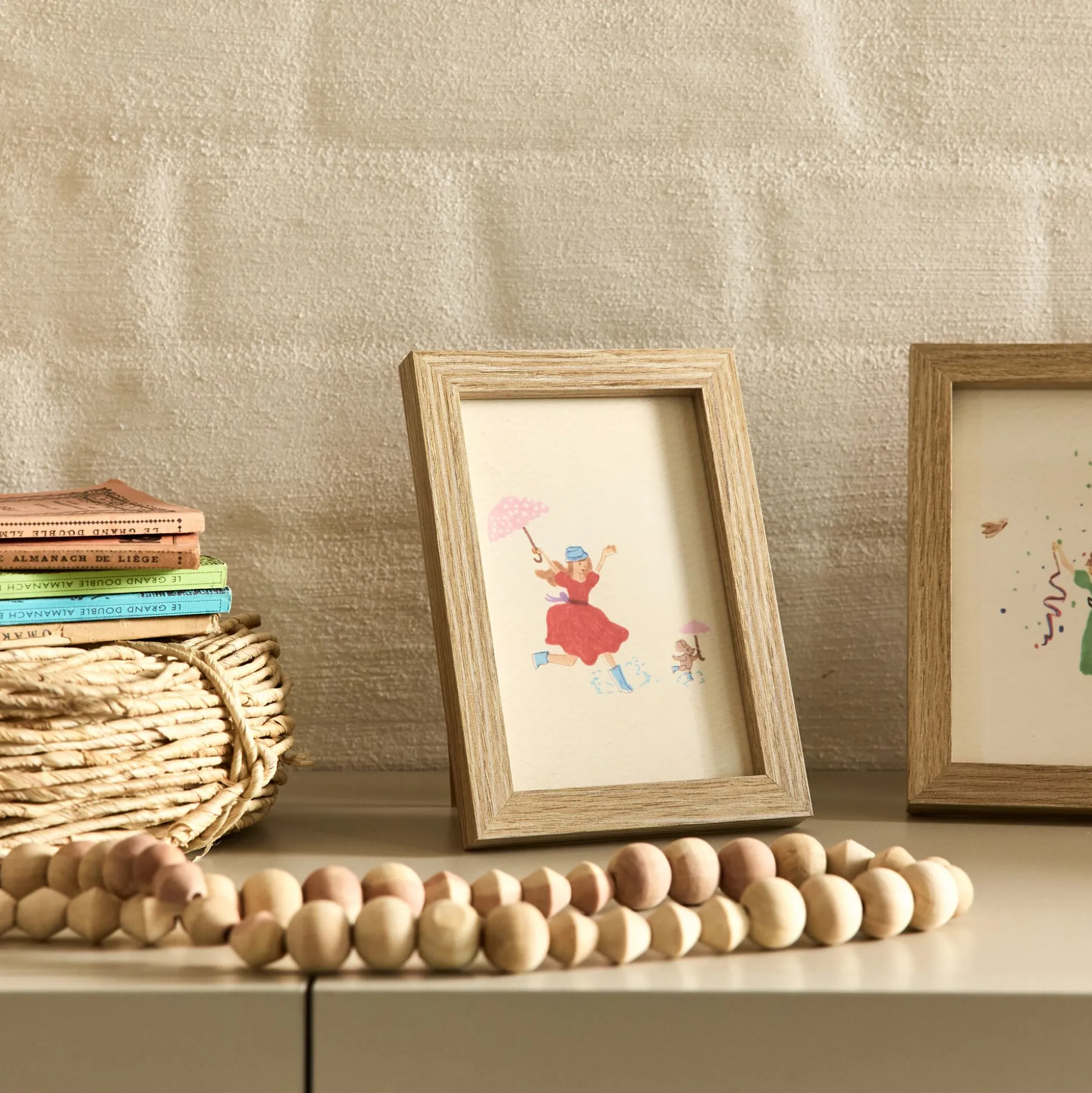 Ce cadre en bois de 12×17 cm invite la poésie dans la chambre enfant. À poser sur une étagère ou à suspendre au mur, il protège sous verre une illustration pleine de tendresse : une fillette en robe rouge danse sous la pluie, accompagnée d’une petite souris. Une scène joyeuse et légère, qui stimule l’imaginaire et réchauffe la décoration enfant d’une note douce et rêveuse.