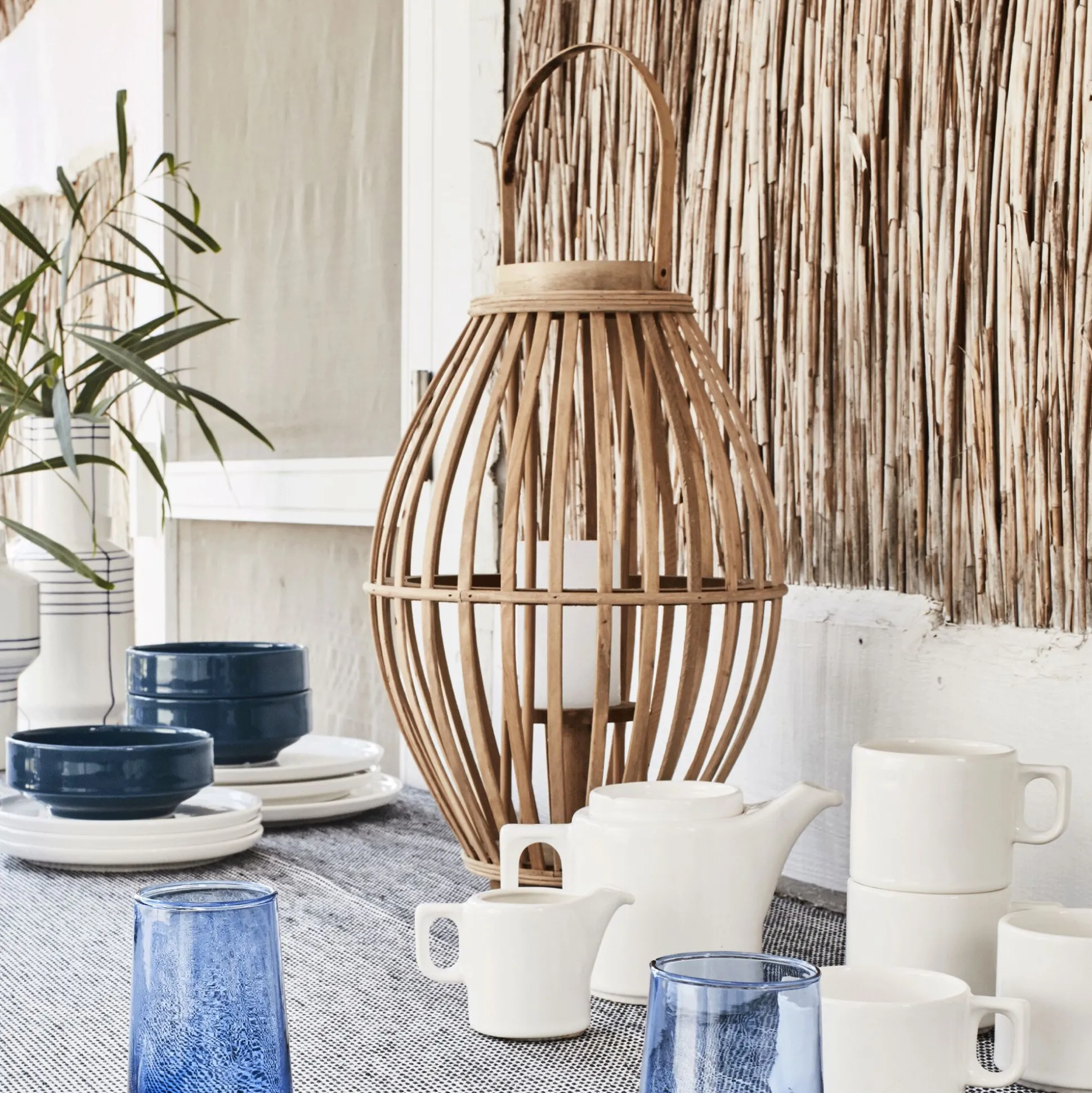Les longues tiges en rotin enferment en leur coeur un bougeoir cylindrique en verre. Ensemble, ces matériaux nobles forment une lanterne ethnique. Sa couleur naturelle, légèrement dorée, offre un objet déco lumineux. Ce jeu de lumière s’accentue avec les bougies qui brûleront en son centre. La flamme vacille et danse dans sa cage naturelle, beauté exotique qui révèle toute la splendeur à la nuit tombée.