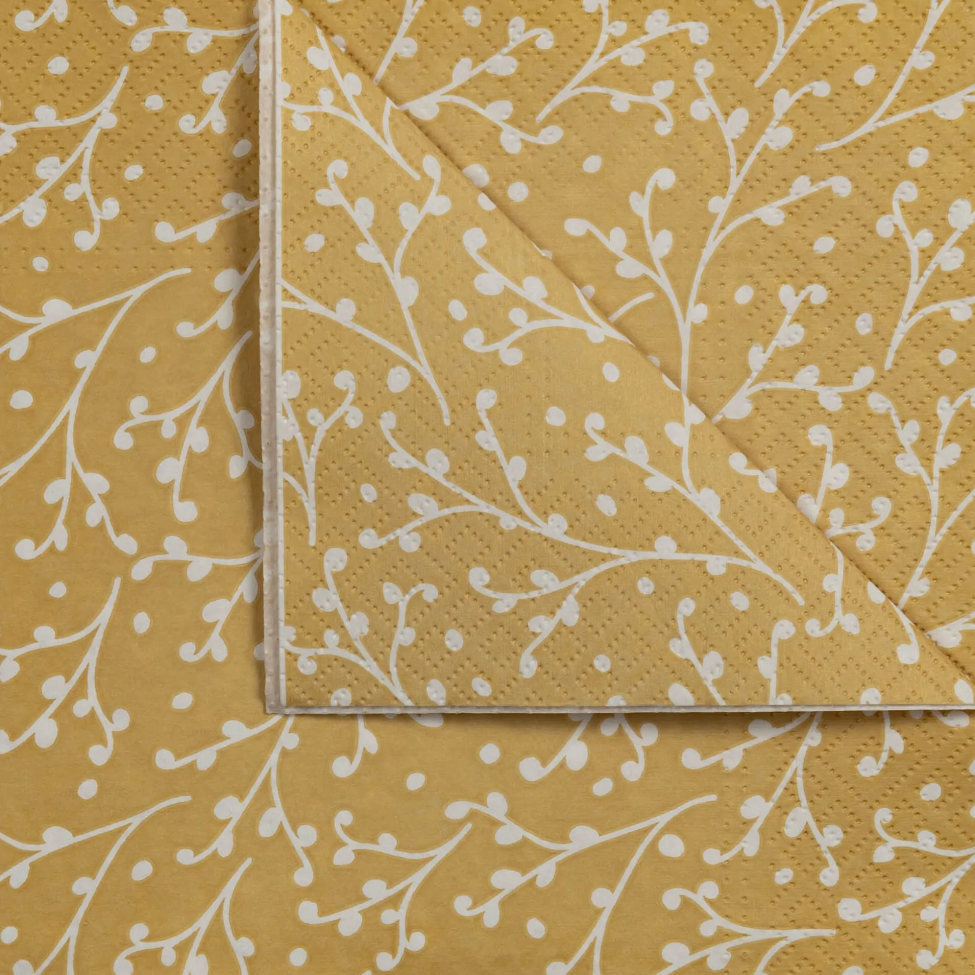 Ce lot de 20 serviettes en papier recyclé habille la table avec chaleur et originalité. Sur un fond jaune lumineux, un motif végétal blanc évoque la silhouette de petites baies, emblèmes naturels des fêtes. Parfaites pour une décoration de Noël raffinée et joyeuse, ces serviettes à usage unique, au format carré de 33×33 cm, permettent aussi de créer de jolis pliages pour sublimer chaque assiette.