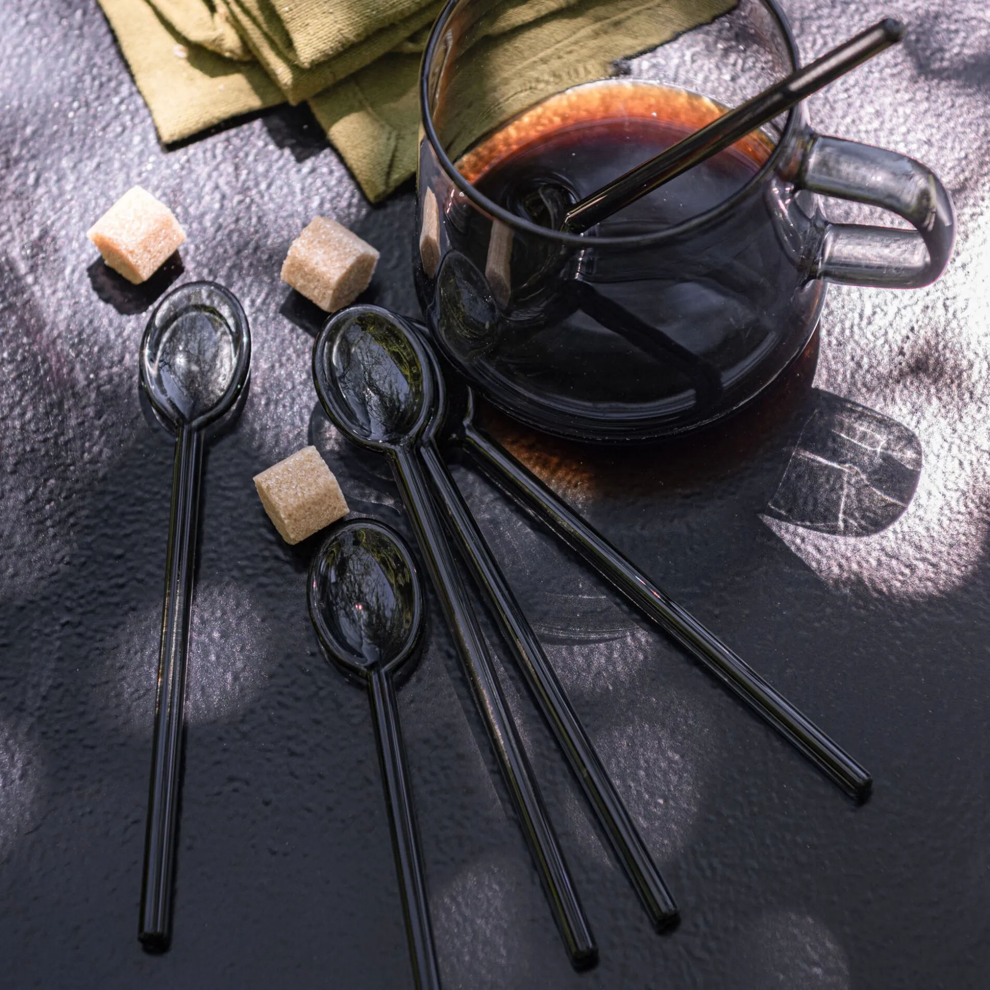 Ce lot de 6 cuillères à café allie finesse et originalité. Confectionnées en verre noir, elles se distinguent par leur silhouette élancée et leur long manche, idéal pour atteindre le fond des grands verres. Parfaites pour mélanger un latte ou savourer un dessert, ces petites cuillères apportent une touche élégante à la pause café.