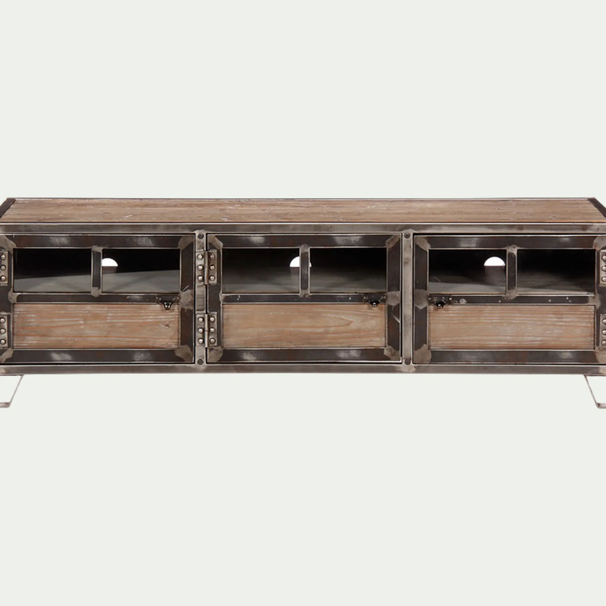 Cette collection de meubles, au style industriel très tendance, donnera du cachet à votre intérieur. Vous apprécierez le mélange de matières de ce beau meuble TV avec 3 portes en pin, acier et verre. Ses compartiments pourront accueillir votre box ADSL, vos consoles des jeux ou tout autres objets de décoration. Il donnera du cachet à votre salon et s’accordera parfaitement avec le reste de vos meubles.