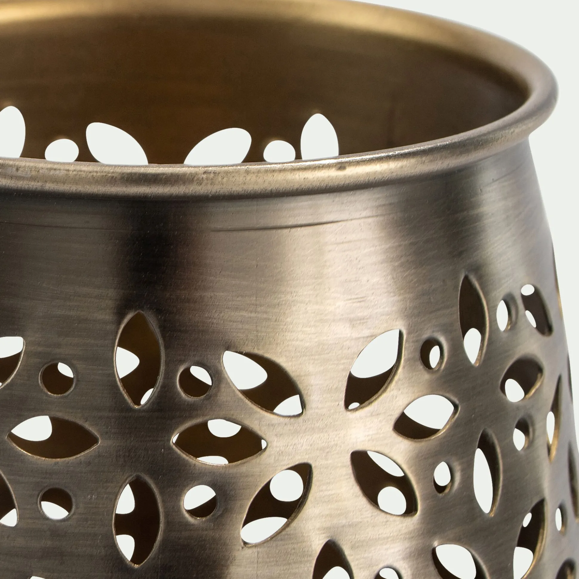 Alassah est un petit photophore confectionné en fer. Le métal est ici travaillé pour créer une forme arrondie, tout en douceur. Des formes organiques ont ensuite été découpées dans la matière pour offrir un jeu d’ombre et de lumière une fois la bougie allumée. Ce motif ajouré évoque des fleurs ou des rosaces : des formes régulières et délicates qui font le charme de ce photophore doré. Placez une bougie en son coeur. La flamme vacille et offre un spectacle de toute beauté le soir venu. Un photophore en métal que l’on aime sur une console ou une table basse.