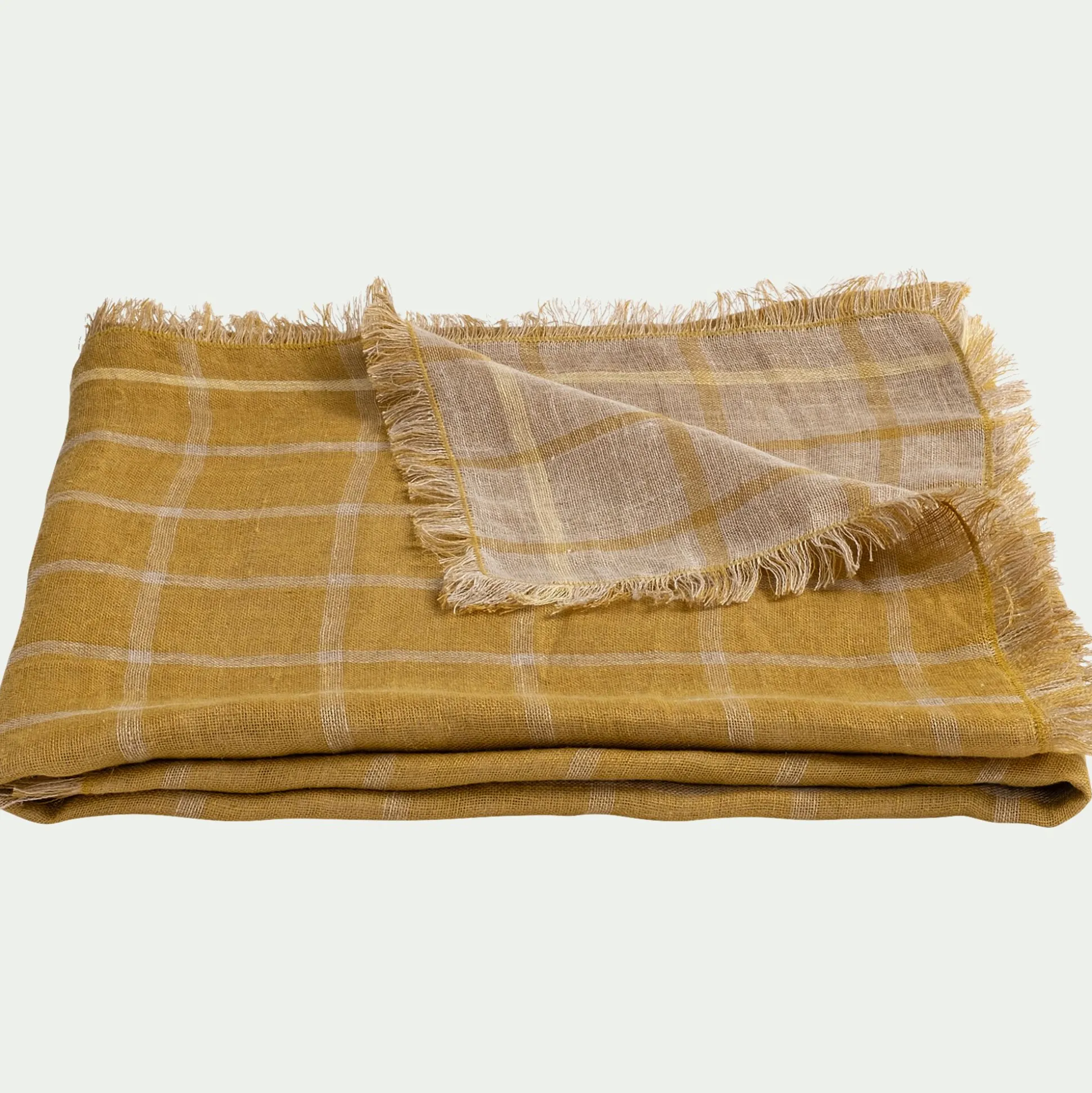 Le jaune se mélange au coloris naturel du lin – une nuance écru – pour donner vie à ce plaid réversible. Confectionné en double tissage, ce plaid en lin lavé offre un beau jeu graphique. Aussi appelé double chaîne, ce procédé est à l’origine de la réversibilité de ce plaid. Le motif à carreaux se fait écho et se complète d’une face à l’autre. Alors que le côté beige apporte fraîcheur et clarté, le côté jaune participe à une atmosphère chaleureuse et conviviale. De 130×170 cm, ce plaid jaune est une véritable source de réconfort lorsque les températures chutent. Son étoffe en lin lavé réchauffe la peau et son coloris solaire réchauffe avec élégance la décoration.