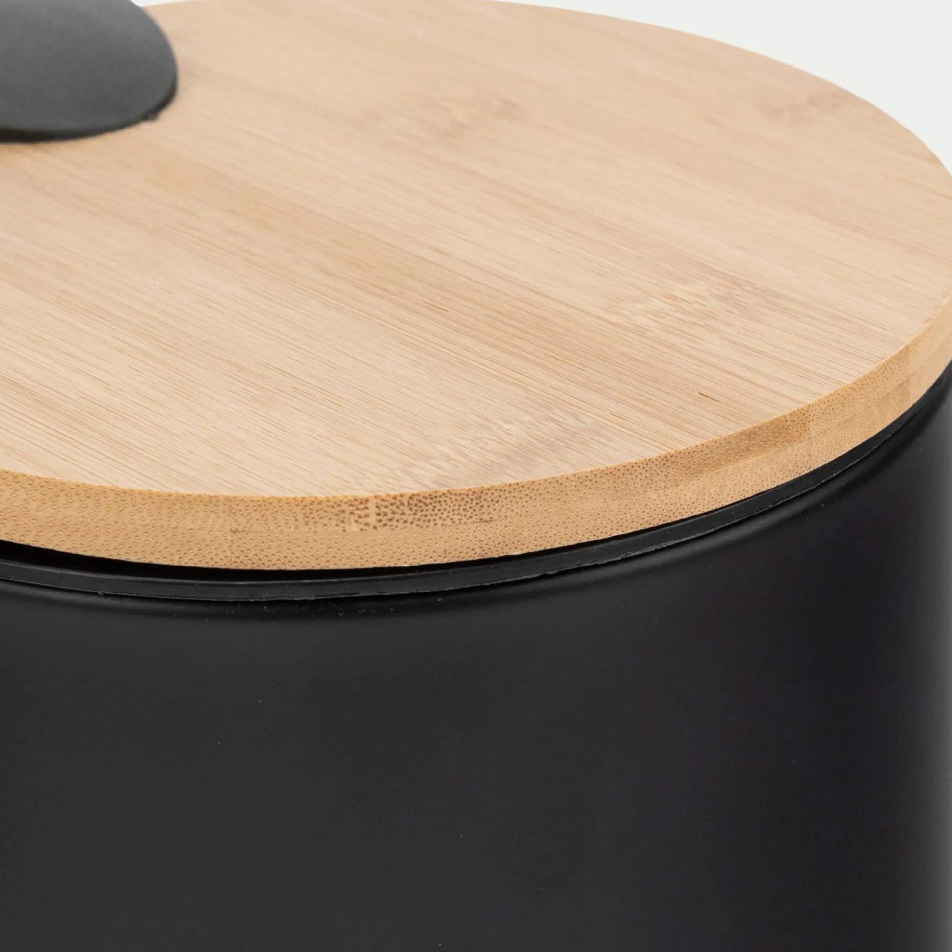 Travaillez les détails de votre décoration avec la petite poubelle Natys. Cette poubelle de 2,5 L est idéale dans une salle de bain. Avec sa petite contenance, elle se glisse parfaitement dans un coin de la pièce et sait se faire discrète. Cette poubelle noir mat est confectionnée en métal. Des détails en bambou viennent réchauffer son design et lui donner une touche naturelle. Cette poubelle de salle de bain fonctionne grâce à une pédale, actionnable au pied. Vos mains restent libres de tout contact : un système qui favorise l’ergonomie et l’hygiène.