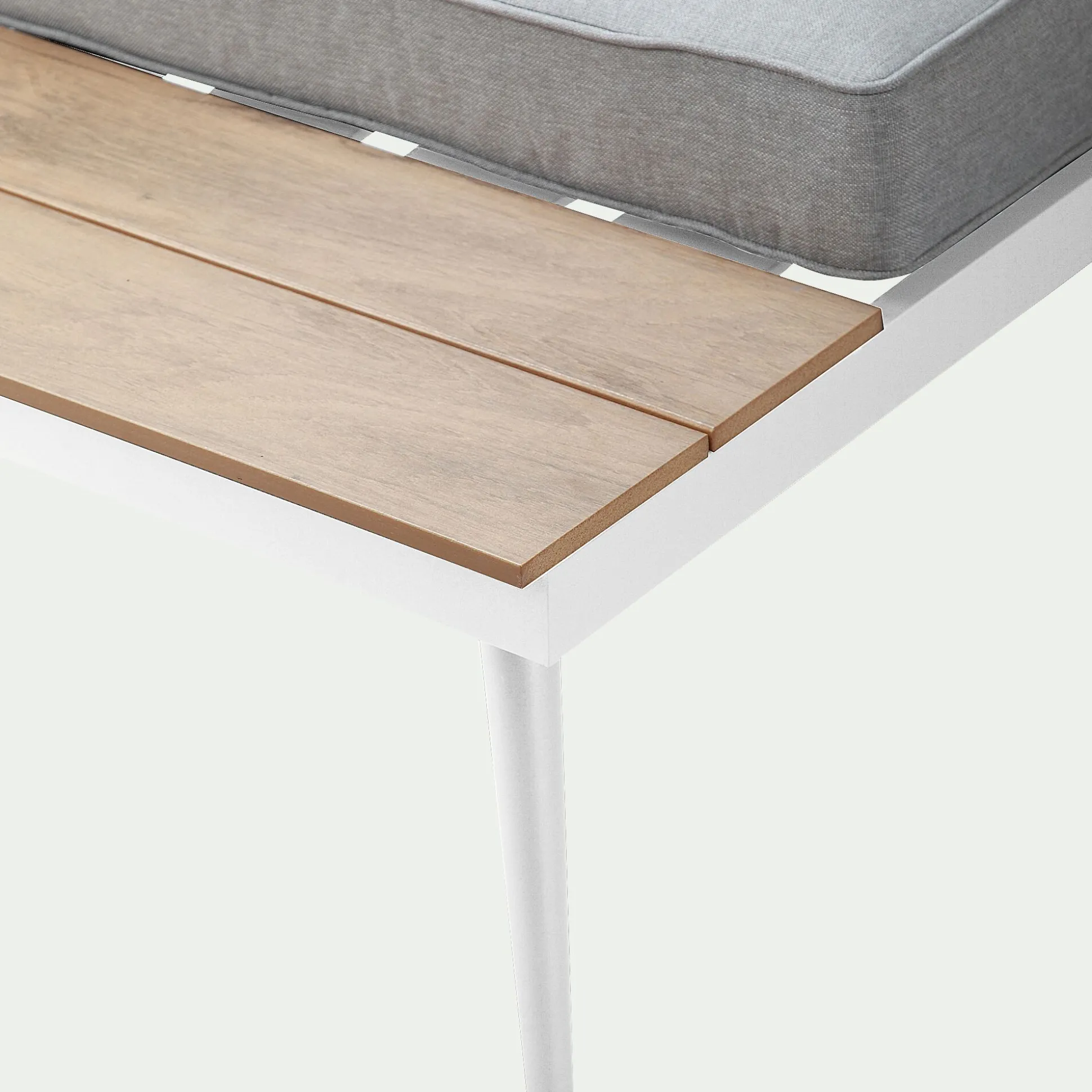 Structure en aluminium finition époxy avec latte en polywood au niveau assise et plateau de table basse.