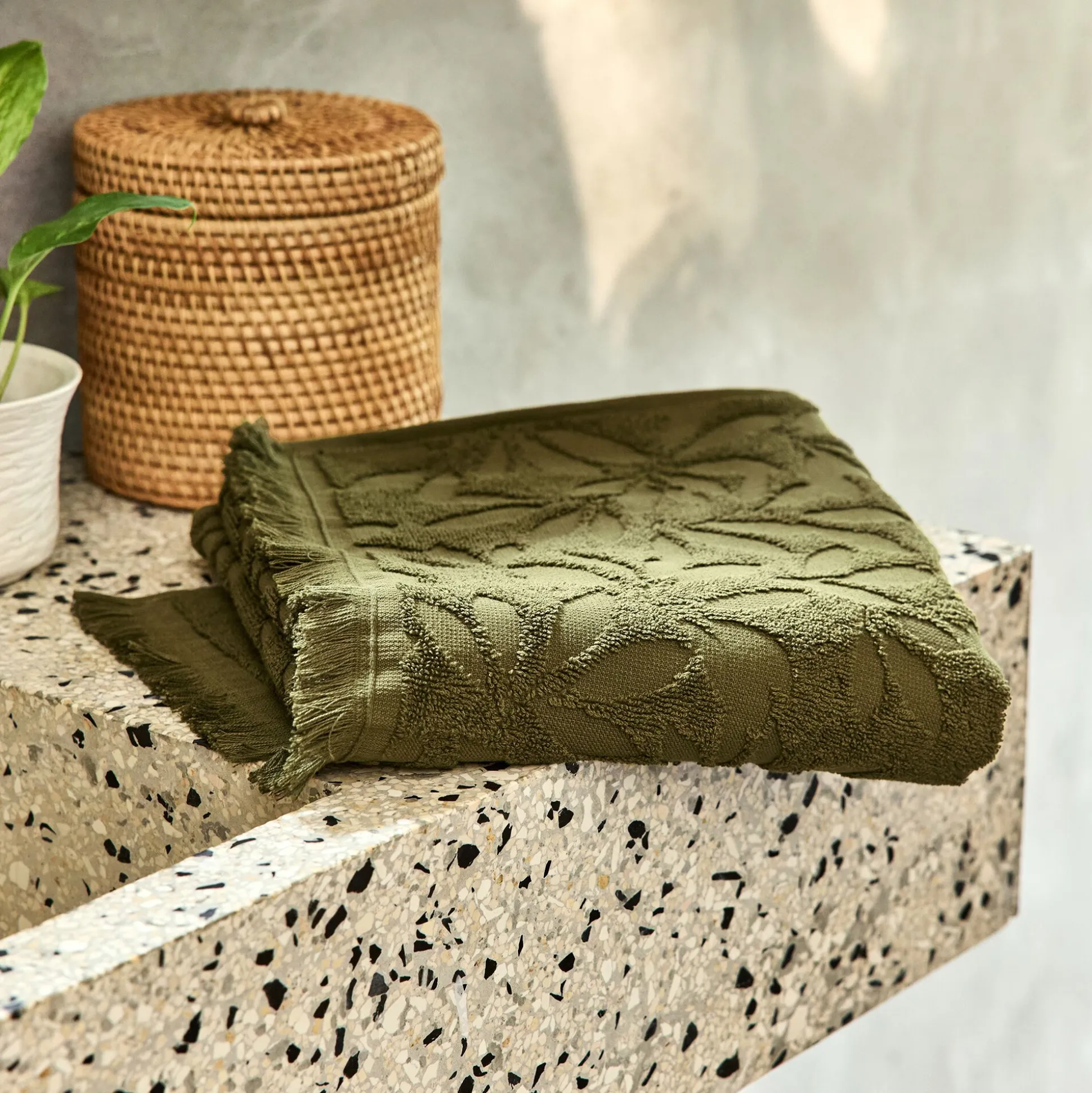 La serviette de toilette Alloro arbore notre coloris vert mousse, une nuance riche qui diffuse une douceur apaisante. Tissée en coton 500 g/m², elle allie confort et absorption optimale. Son motif floral en jacquard et sa finition frangée ajoutent une touche raffinée. Fabriquée au Portugal et certifiée Oeko-Tex, cette serviette de 50×100 cm s’inscrit dans une démarche durable.