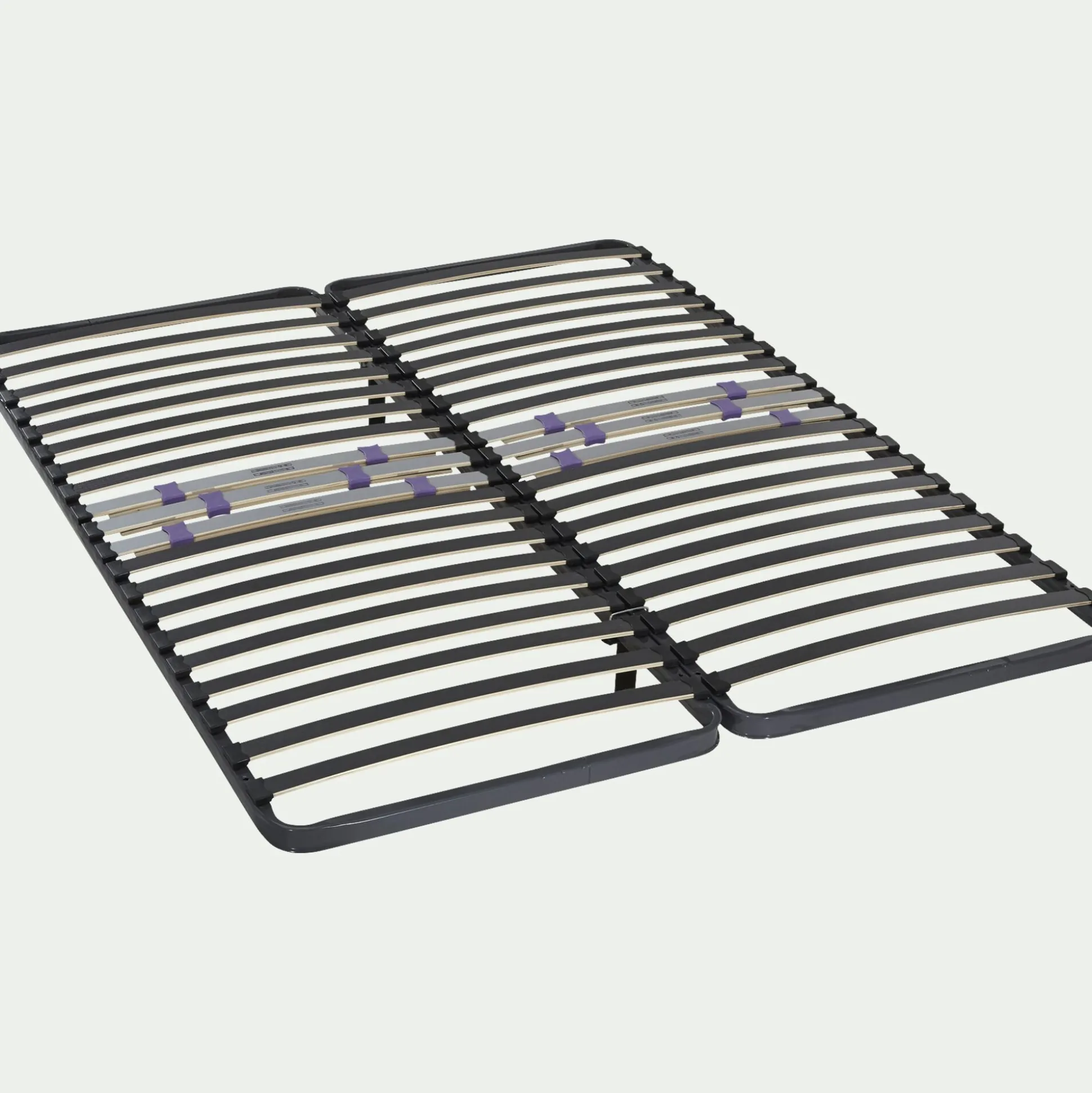 Lattes : 2×20 lattes décor multiplis en bois de bouleau de 50mm de largeur pour 8mm d’épaisseur. Système Anti-Gliss. Au centre, 3 doubles lattes vissées avec régulateurs de confort indépendants sur zone lombaire.