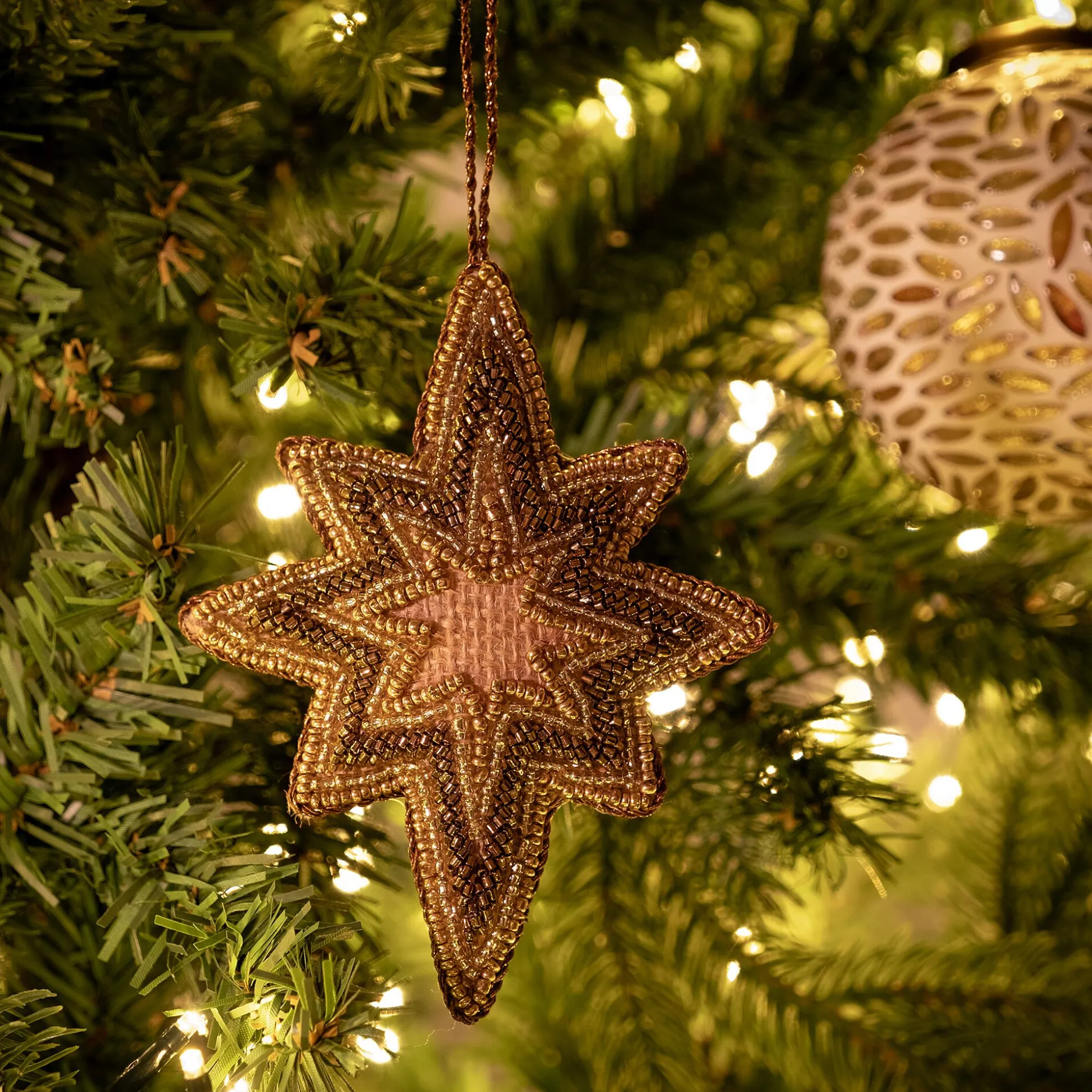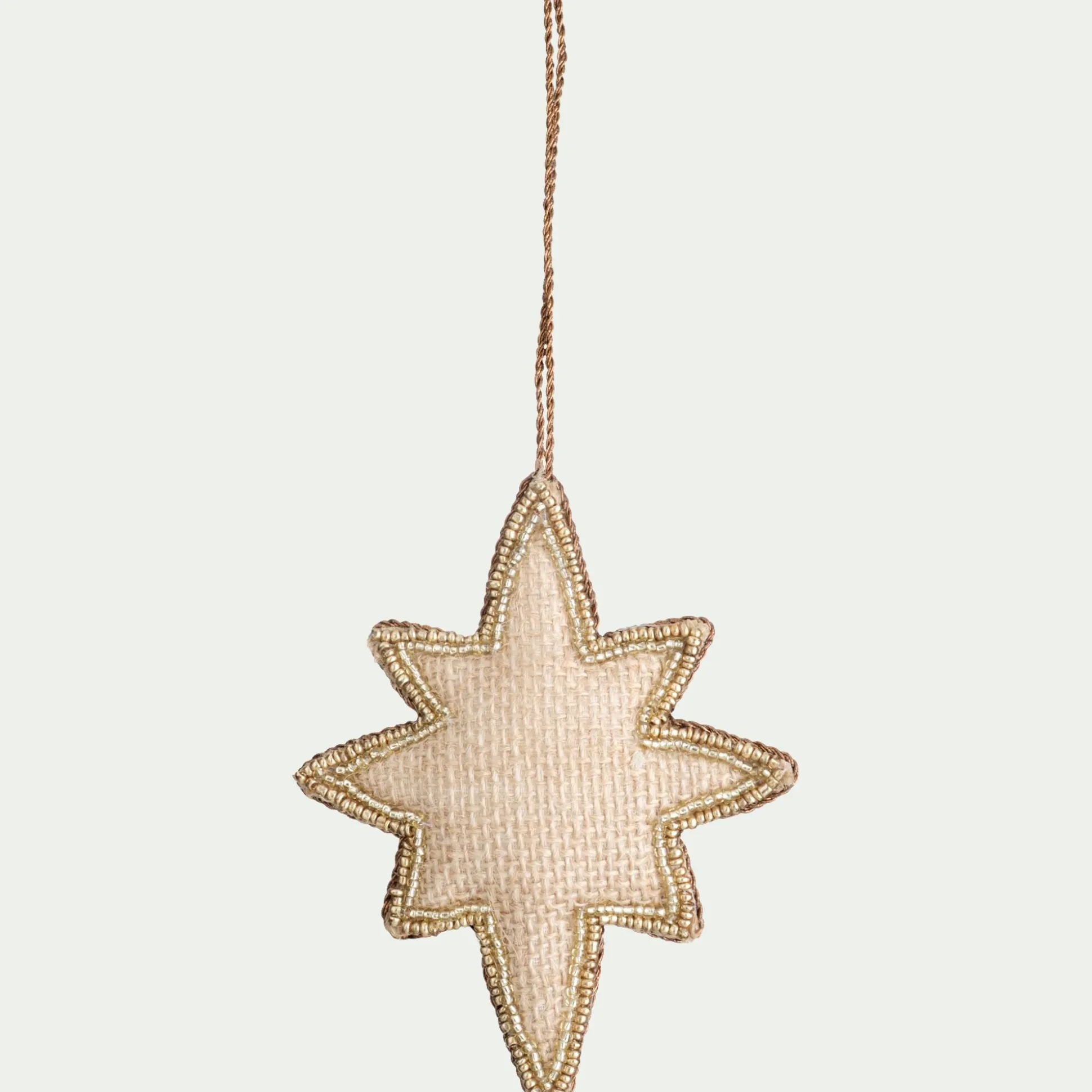 Apportez une touche d’originalité à votre sapin avec cette suspension de Noël en forme d’étoile. Conçue comme un patch en jute, elle se distingue par ses perles dorées cousues avec du zari, un fil de broderie indienne. Son allure authentique et festive fait d’elle un véritable bijou pour votre arbre de Noël. Cette étoile, à la fois simple et éclatante, capte la lumière et rehausse votre décoration de Noël avec son éclat.