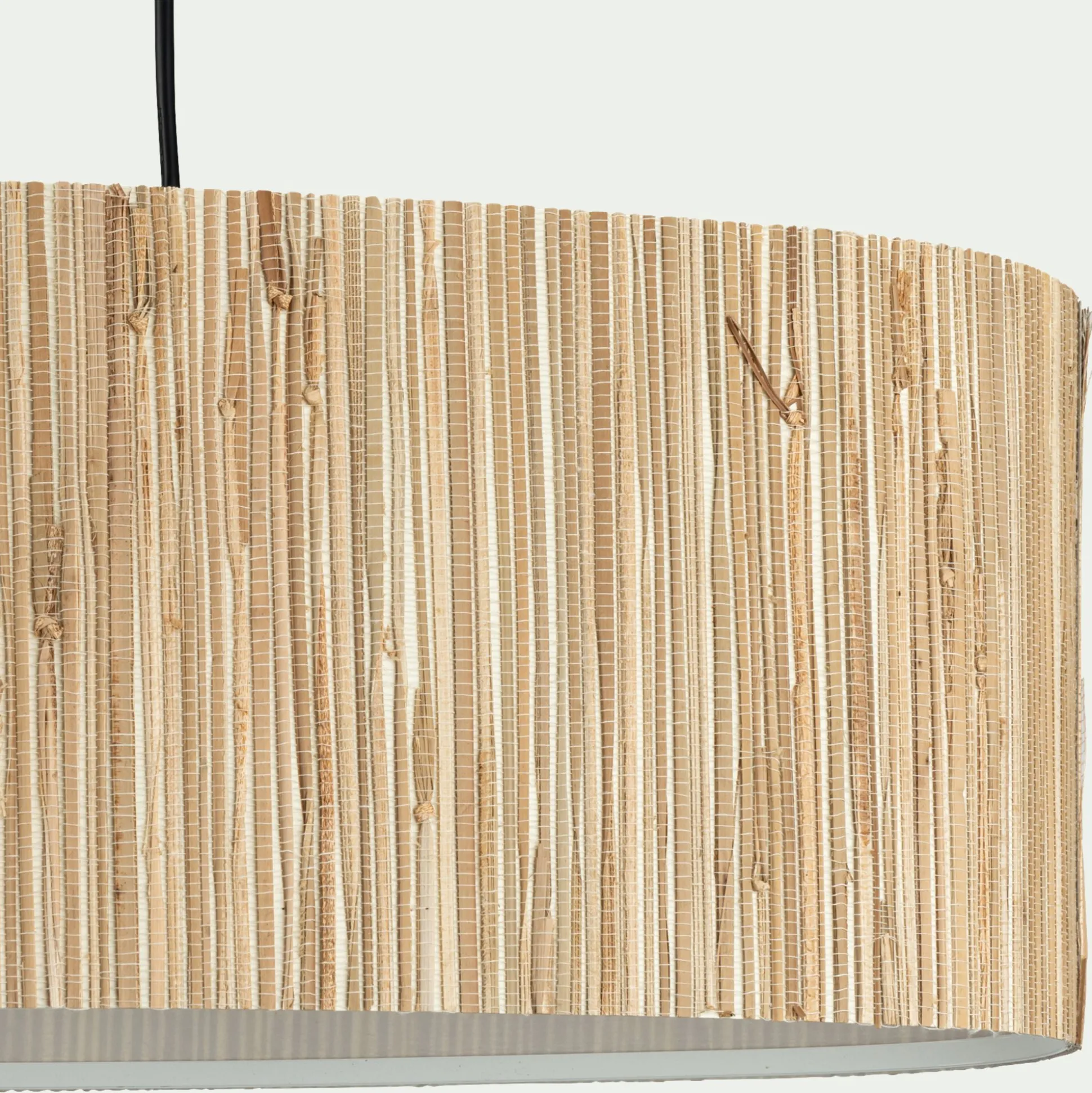 Cette majestueuse suspension électrifiée habille vos hauteurs sous plafond avec charme et élégance. Circulaire, cette suspension naturelle dissimule en son sein deux lampes. Leur fusion donne vie à une suspension XXL qui s’impose comme la pièce maîtresse du séjour. Ce luminaire présente une structure en acier noir, délicatement soulignée par un abat-jour en algues. Les fibres naturelles sont tissées entre elles pour créer ce camaïeu de nuances dorées qui viennent illuminer la pièce. Originale, cette grande suspension en algues participe à une atmosphère accueillante et conviviale.