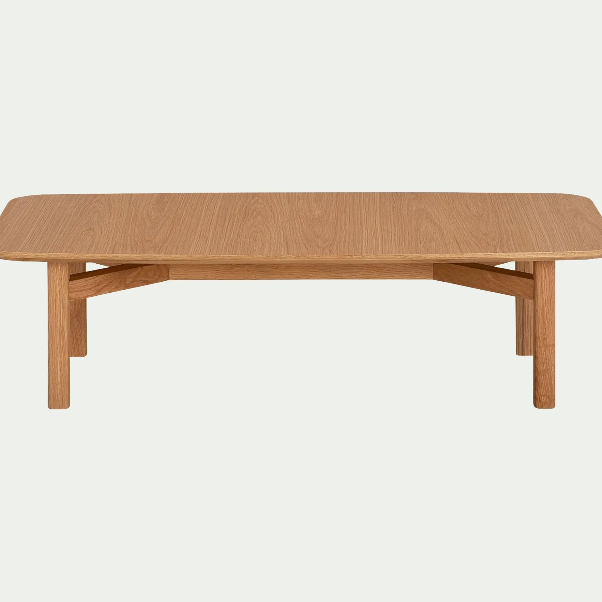 Cette table basse rectangulaire en plaqué chêne arbore un design sobre et chic. Ses pieds en bois massif légèrement en compas et ses angles arrondis apportent à ce meuble de salon style et un charme incontestable. Ce mobilier apportera du cachet à votre intérieur. Placée sur un beau tapis près de votre canapé, cette table basse marquera la déco de la pièce.
