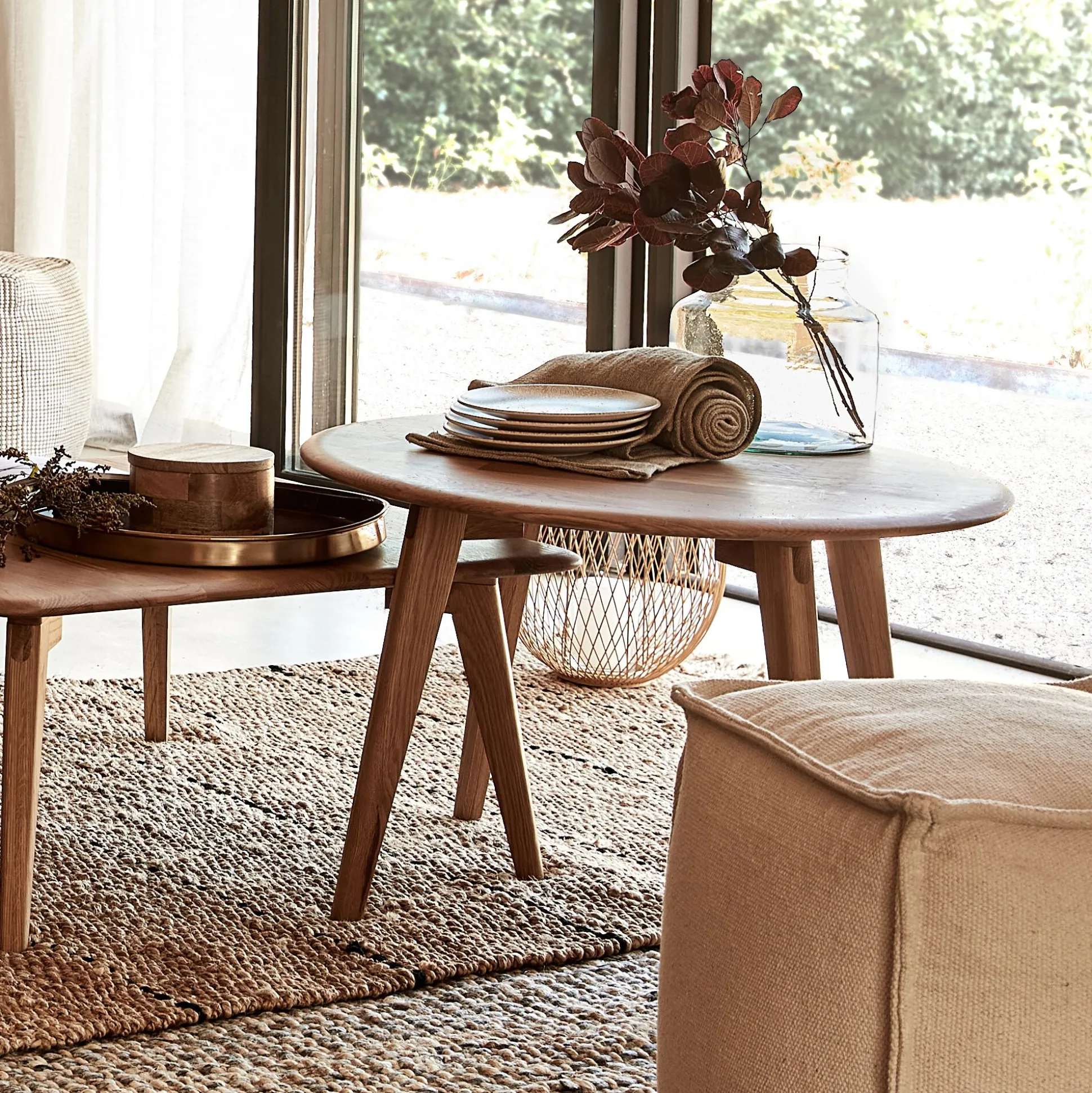 Lagos est une petite table basse pensée pour convenir à tous les styles d’intérieur. D’une grande simplicité, elle se présente sous la forme d’un plateau rond et de trois pieds. L’ensemble est fabriqué dans du bois massif et plus particulièrement dans du chêne. Cette essence de bois est reconnue pour être résistante. Elle offre à ce meuble de salon un coloris clair, arboré de quelques veinures plus sombres pour un rendu naturel. Cette table basse ronde est ensuite vernis pour assurer sa longévité. De 46 cm de hauteur, cette table basse en chêne se combine aux deux autres tables Lagos pour un rendu gigogne.
