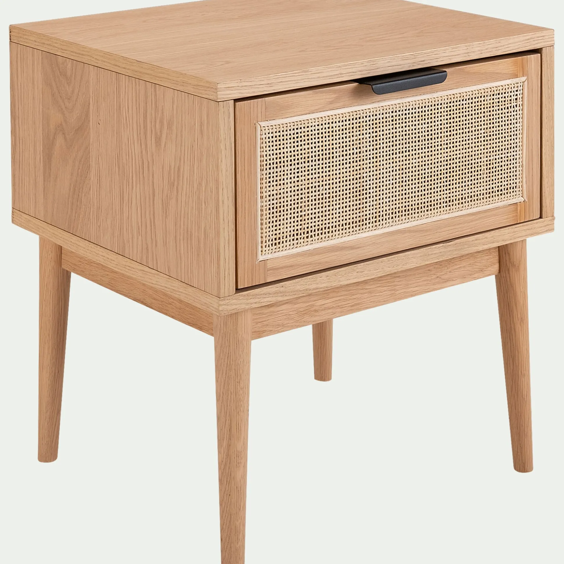 Réchauffez la décoration de la chambre avec cette table de chevet en bois et cannage. La structure en chêne massif arbore un coloris clair, orné de fines veinures. Brut et authentique, ce cadre s’accompagne d’une finition en cannage et d’une poignée noire. Simple mais design, cette table de nuit peut accueillir votre lampe de chevet, un livre, une plante, des cosmétiques… Dans son tiroir coulissant, rangez quelques affaires et profitez d’un intérieur propre et ordonné.