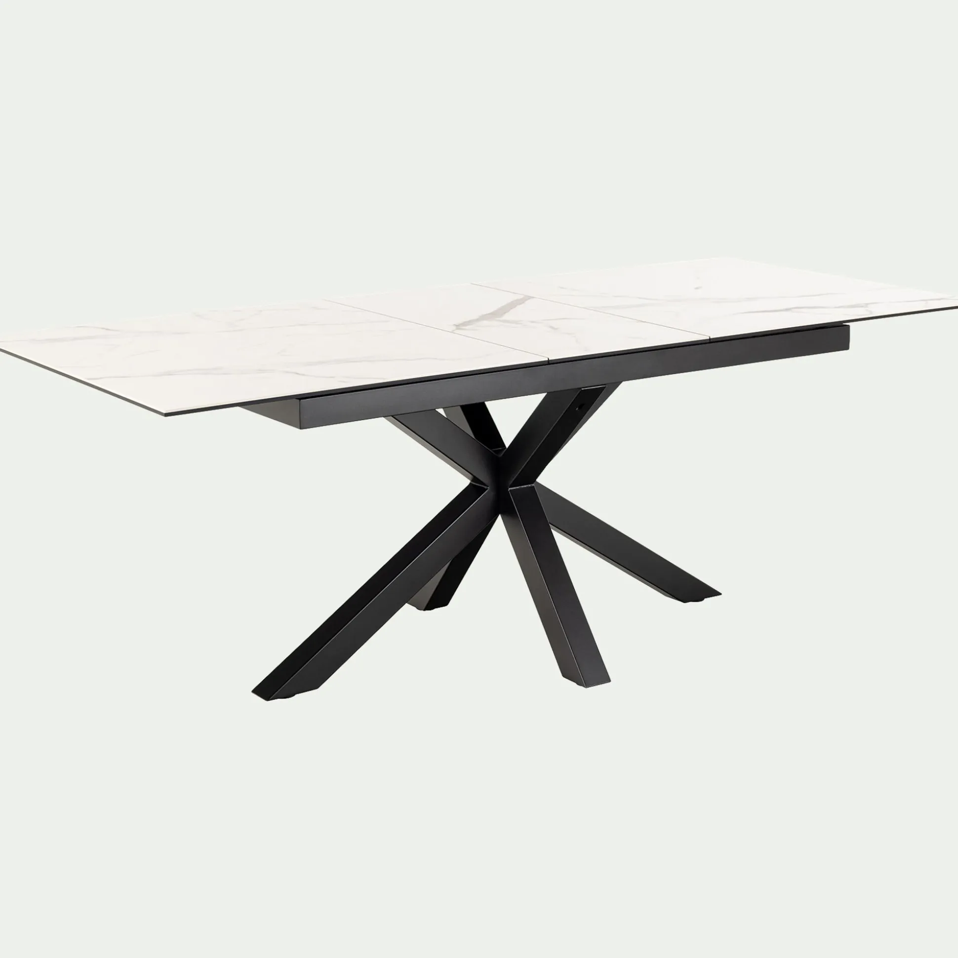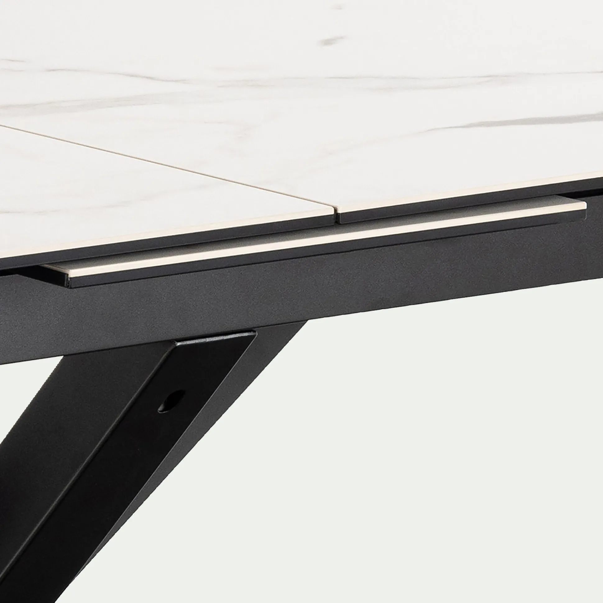 La table de repas 8 places Isota offre un look lumineux et contemporain. Son plateau blanc en céramique et verre trempé contraste élégamment avec le piètement en acier noir. Facile à agrandir grâce à sa rallonge automatique intégrée, elle passe de 168 à 210 cm pour accueillir jusqu’à 8 convives. Cette table extensible conjugue esthétique et durabilité avec brio.